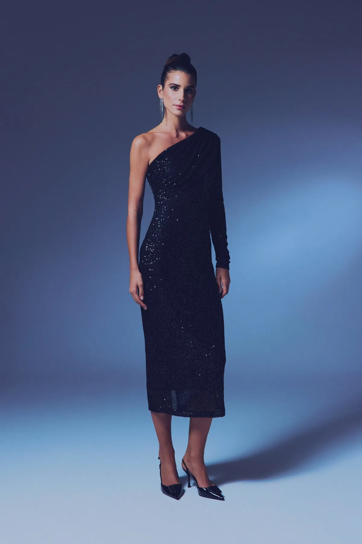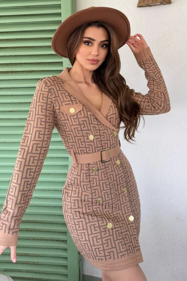 فستان نسائي محبوك مضلع متوسط الطول بأكمام طويلة و سحاب أمامي