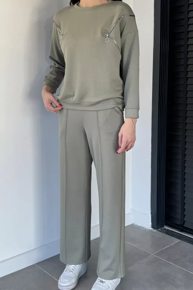 طقم ريبان قطعتين بتوب كتف واحد مع شريط متقاطع وبنطال مريح لِلوك يومي عصري وعملي.
