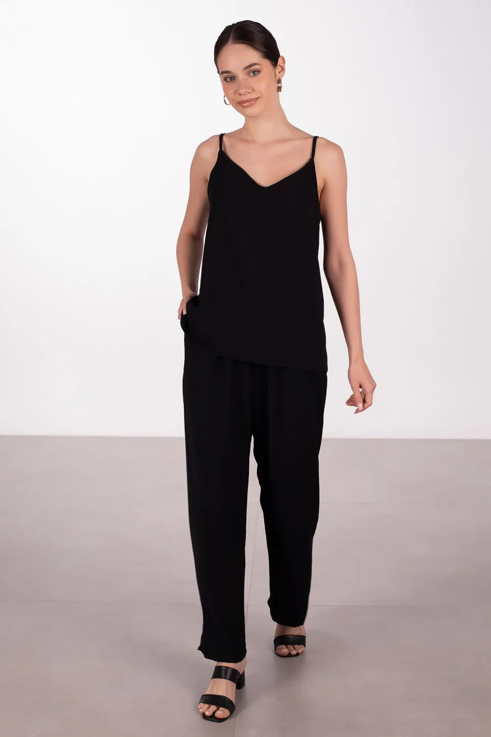 طقم ريبان قطعتين بتوب كتف واحد مع شريط متقاطع وبنطال مريح لِلوك يومي عصري وعملي.