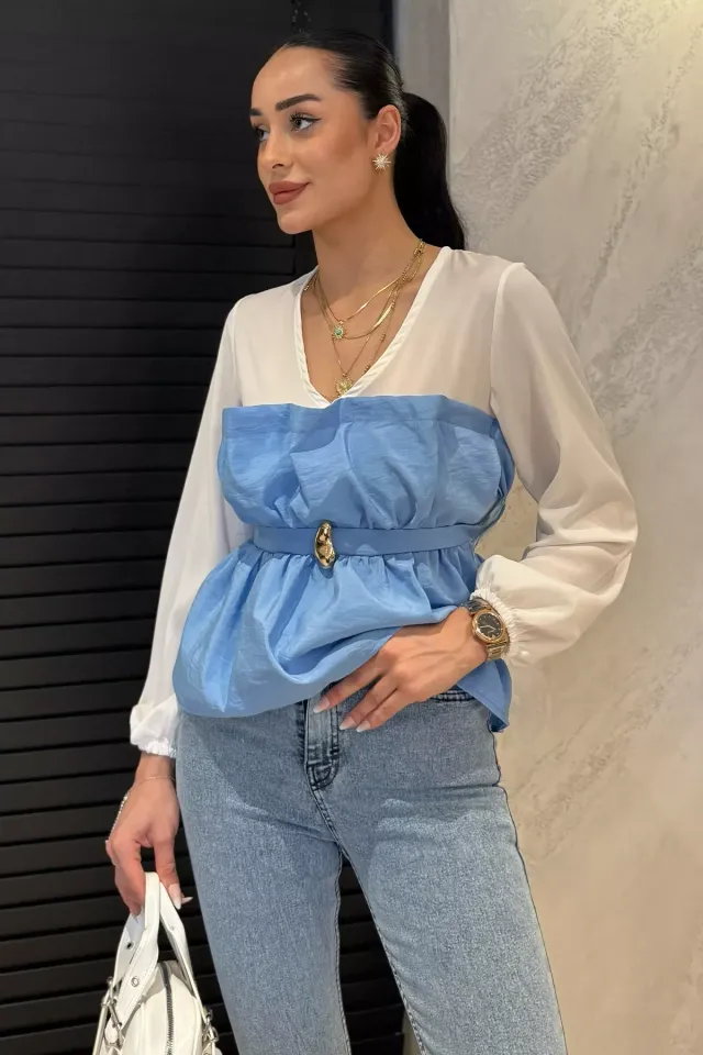 بلوزة نسائية بياقة V من قماش دالغيتش بنقشة منقوشة ناعمة بقصة مريحة لإطلالات يومية أنيقة.