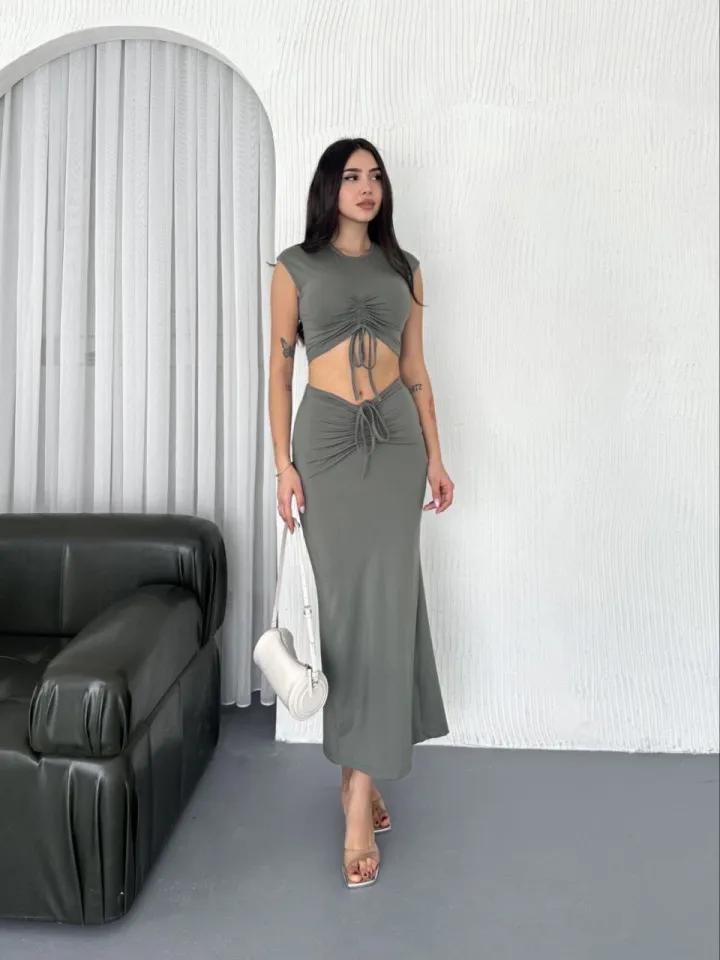 طقم نسائي بقصة محددة ببلوزة ياقة V حاكم وتنورة ميدي بملمس مجمّع لِلوك يومي أنيق وشيك.