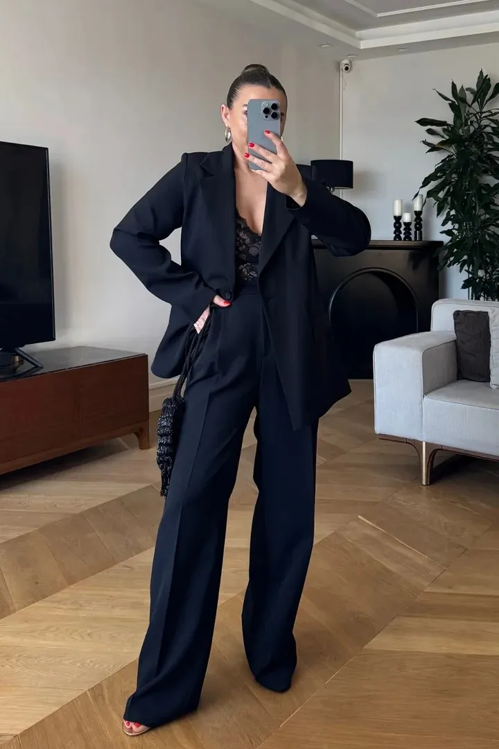 بنطال فيسكون مستقيم بخصر عالي وتفصيل أربطة جانبية متقاطعة مع شق لِلوك صيفي عصري وشيك.