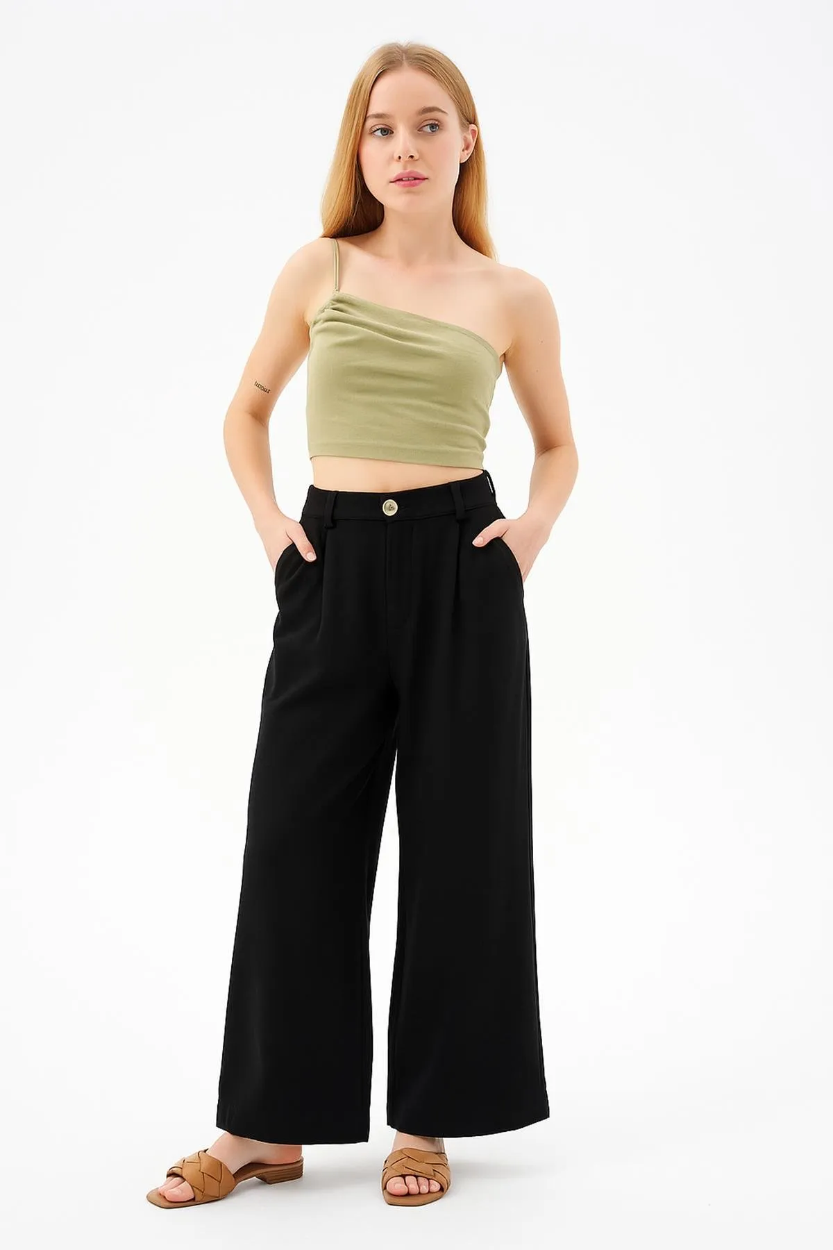 بنطال فيسكون مستقيم بخصر عالي وتفصيل أربطة جانبية متقاطعة مع شق لِلوك صيفي عصري وشيك.