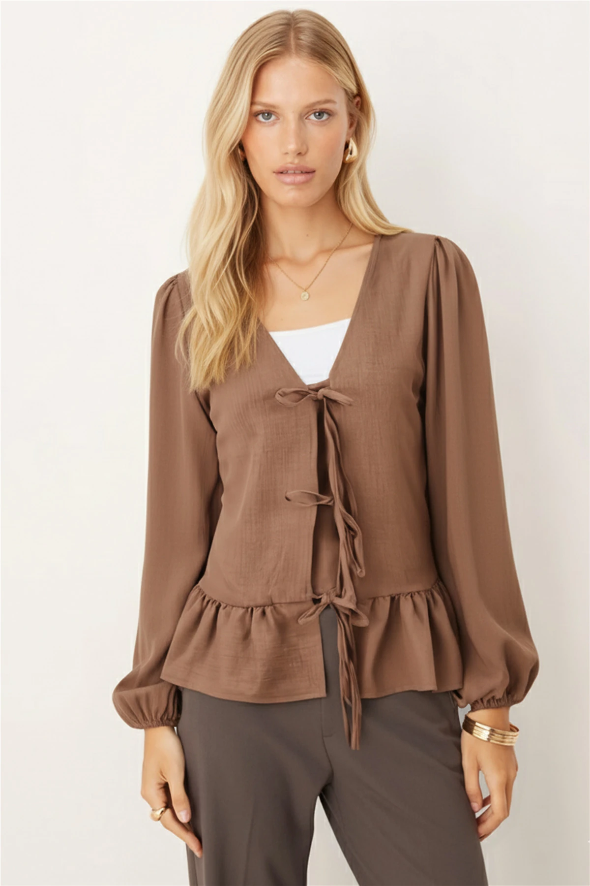 طقم نسائي من قطعتين يتكون من بودي فيسكوز وبلوزة طويلة الأكمام بتصميم مفتوح من كتف واحد لإطلالة عصرية بطبقات أنيقة.