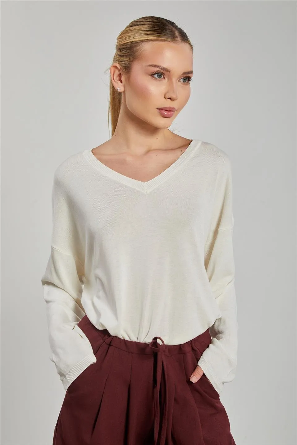 بلوزة نسائية محبوكة بياقة دائرية وأكمام طويلة - Beyond Store