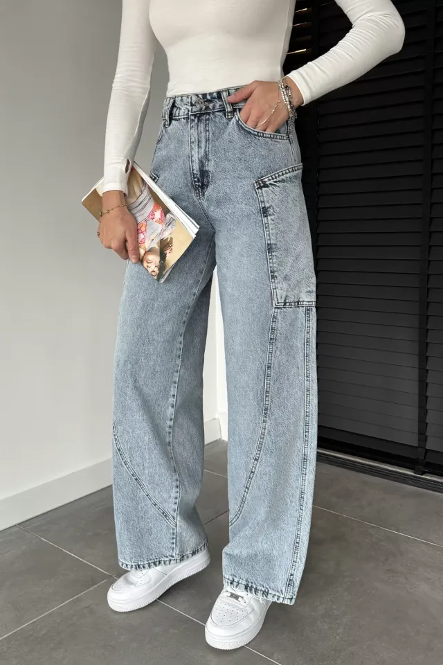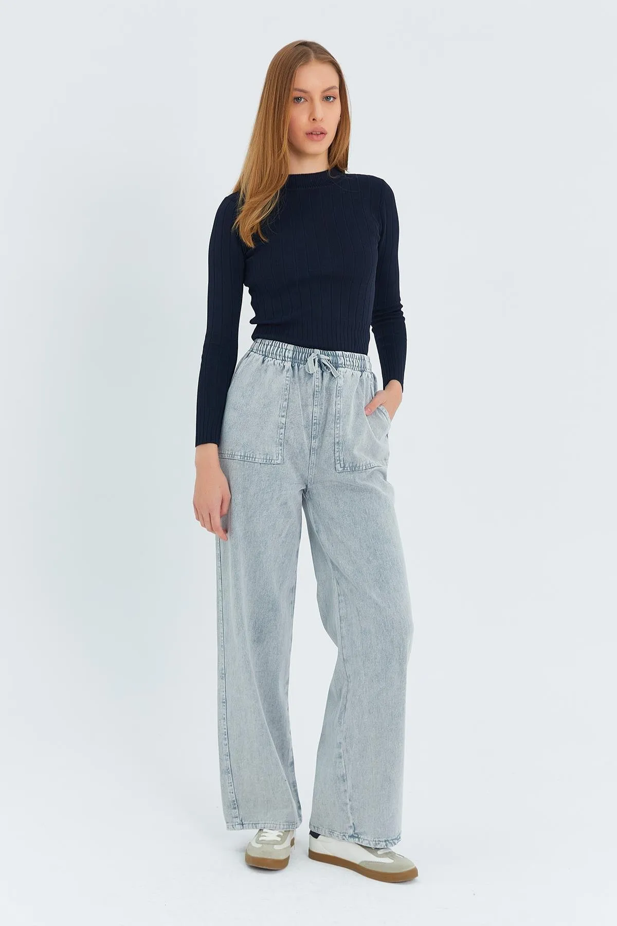 بنطال نسائي بخصر مرتفع مع مطاط جانبي وتفصيل أزرار أمامية لإطلالة يومية مريحة وعصرية.