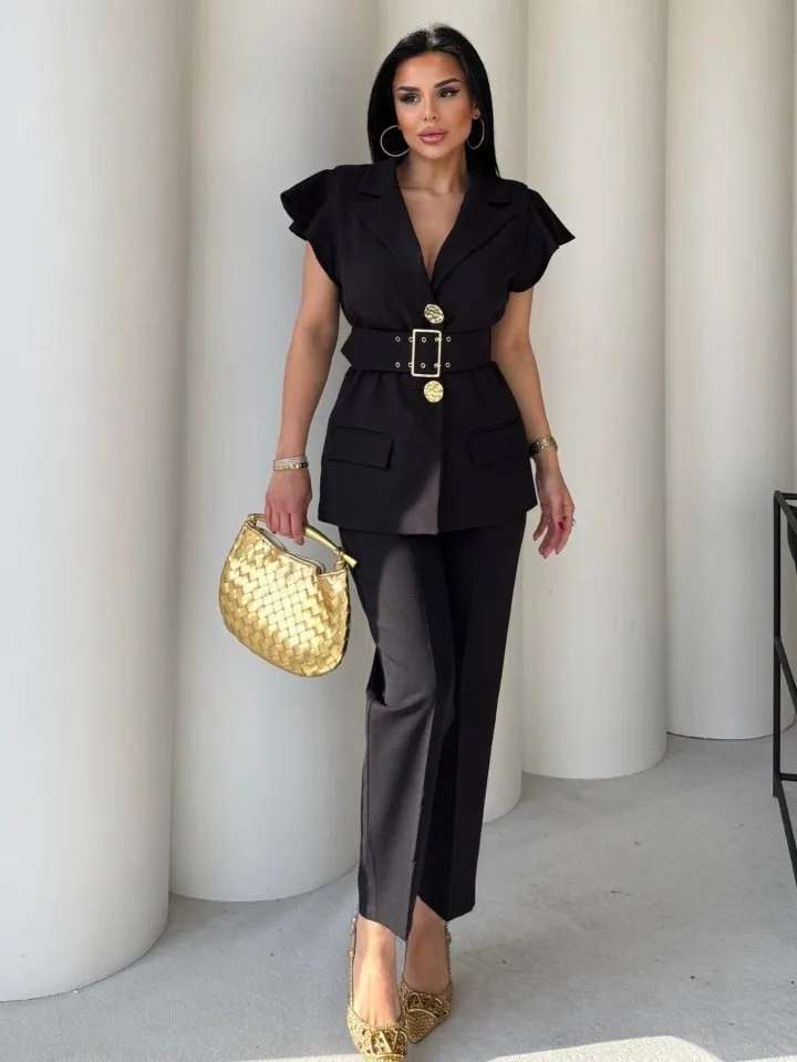 طقم نسائي من المخمل بطباعة حروف مع بلوزة بياقة مستديرة وبنطال بخصر مطاطي لراحة وأناقة موسمية.