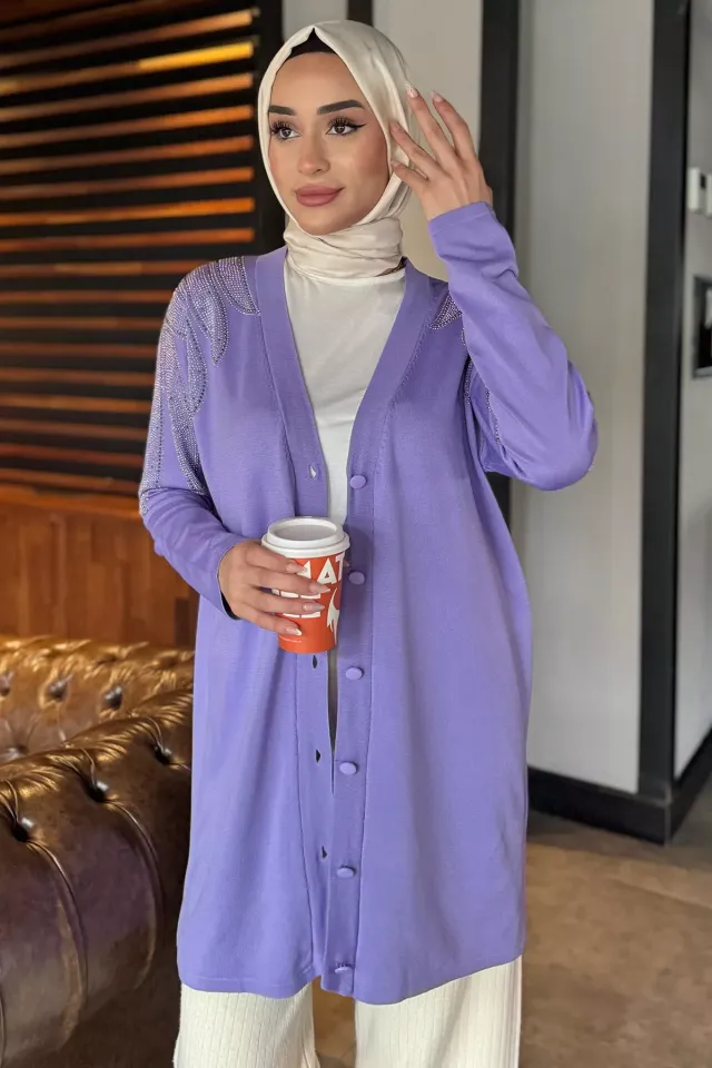 كارديجان محبوك بأكمام طويلة مع تطريز زهوري وتفاصيل أحجار الراين اللامعة، يمنح إطلالة محتشمة وأنيقة. مصنوع من قماش ناعم وخفيف لراحة وانسيابية طوال اليوم.