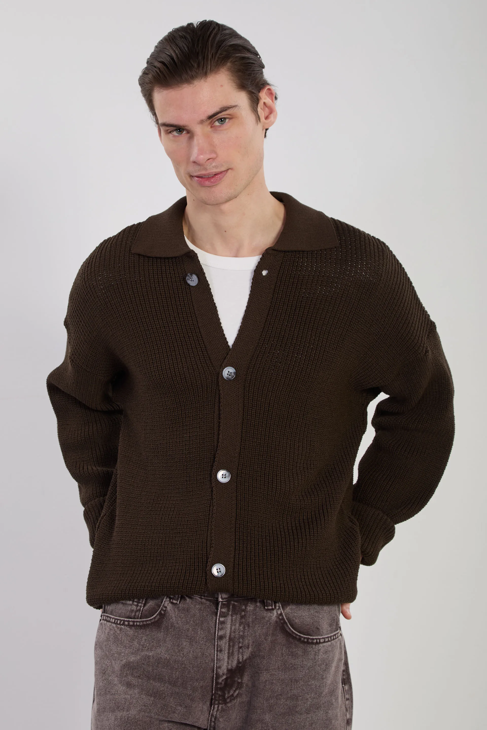 سترة رجالية سادة بأكمام طويلة وياقة دائرية وأكتاف منسدلة