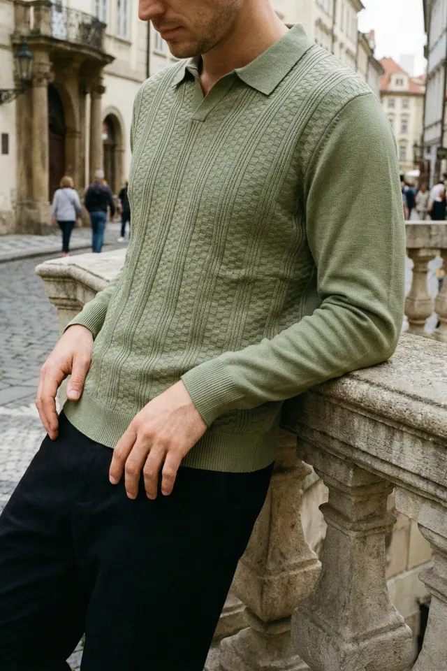 كارديغان رجالي سادة بقصة مريحة وأكمام طويلة مع ياقة بولو وأزرار امامية