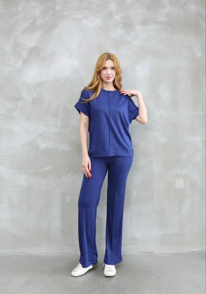 طقم مخطط ببلوزة كم طويل بياقة دائرية مع بنطال بخصر مرن لِلوك يومي مريح وشيك.
