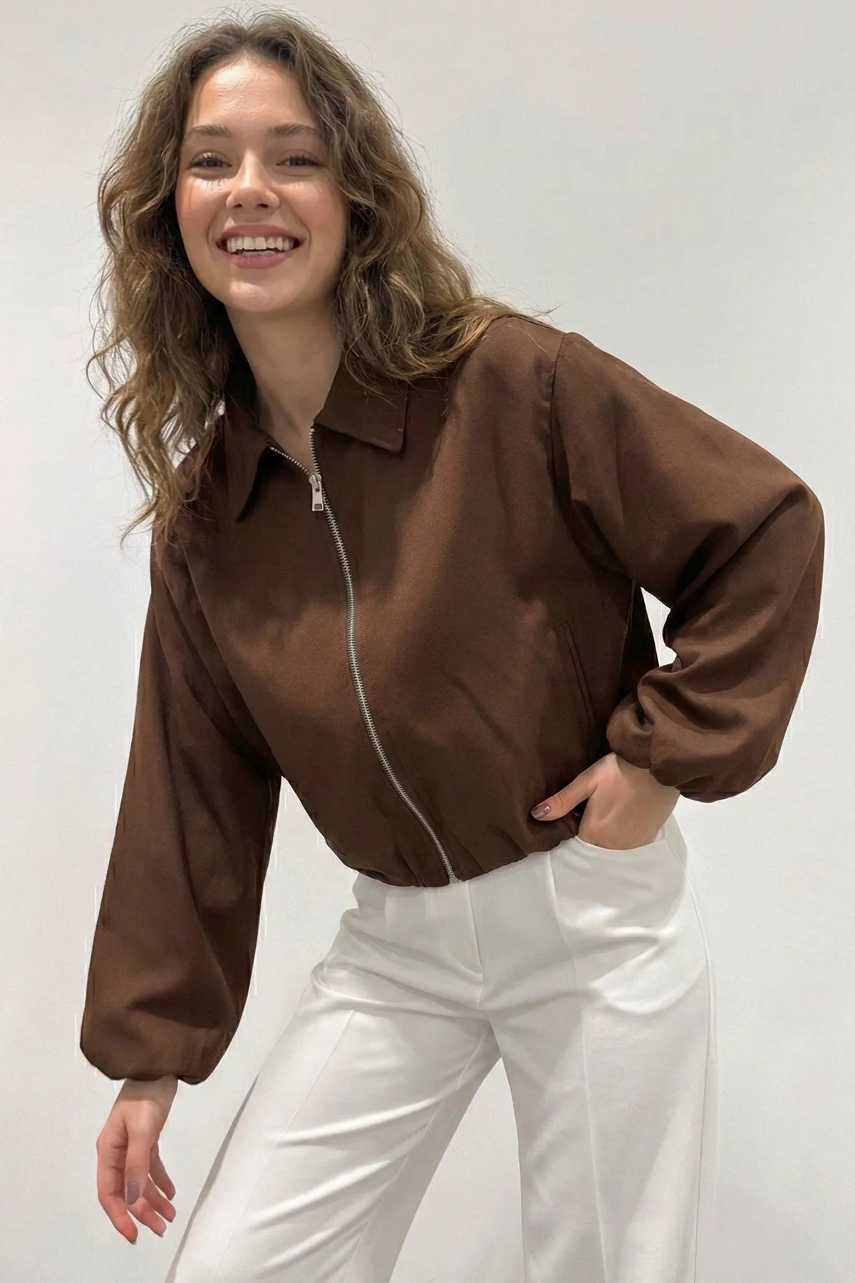 جاكيت قصير من قماش شاردون بأكمام طويلة وسحاب أمامي لستايل يومي مريح وعصري.