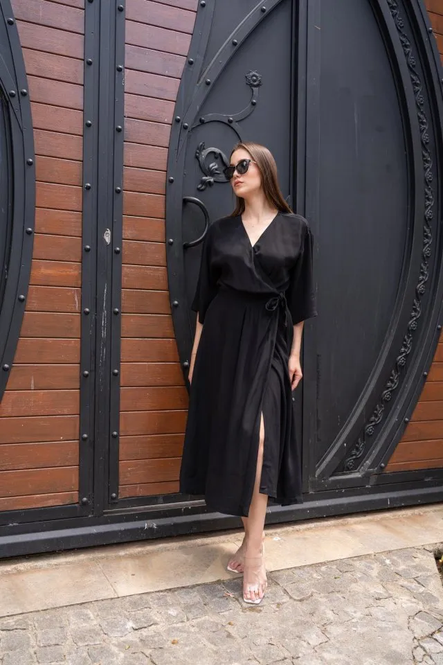 فستان نسائي ميدي بياقة دائرية وتصميم مخطط