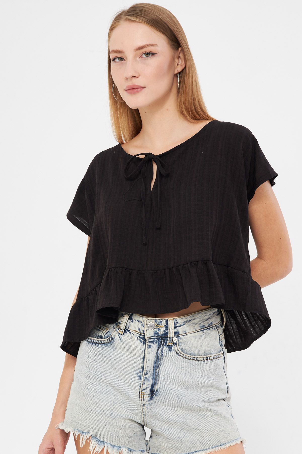 بلوزة نسائية بأكمام طويلة وياقة V عميقة مع تفاصيل طيات أمامية ناعمة، تمنح إطلالة أنثوية وأنيقة، مصنوعة من خامة خفيفة وناعمة، مثالية للإطلالات اليومية أو المسائية الأنيقة.
