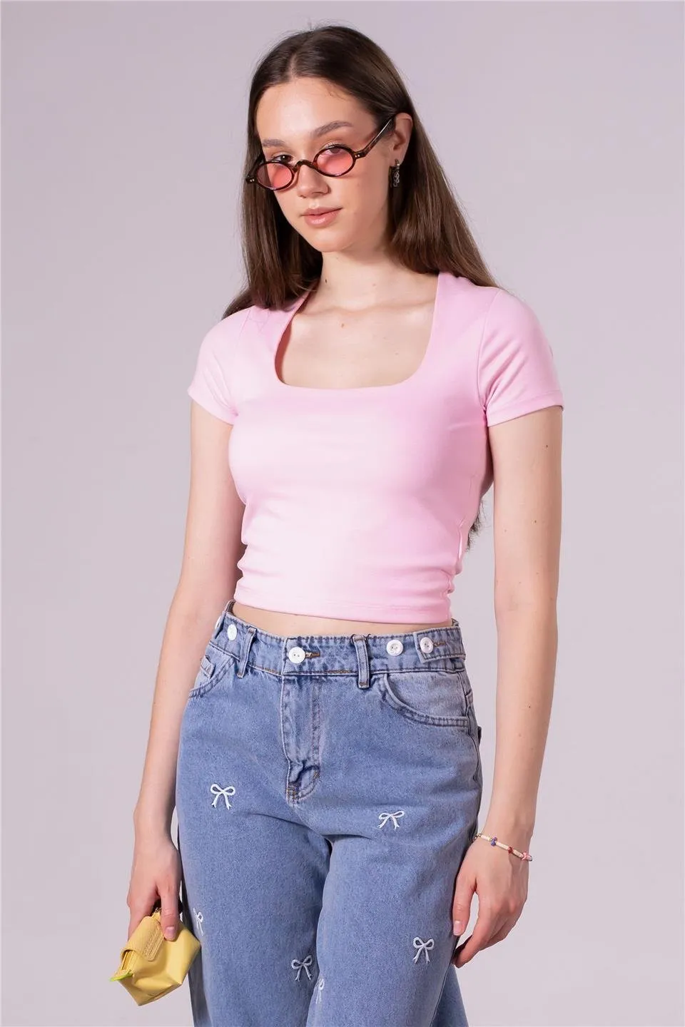 توب كروب مريح بقصة محددة وتفصيل فيونكة مطرزة وياقة دائرية لستايل يومي كيوت وعصري.
