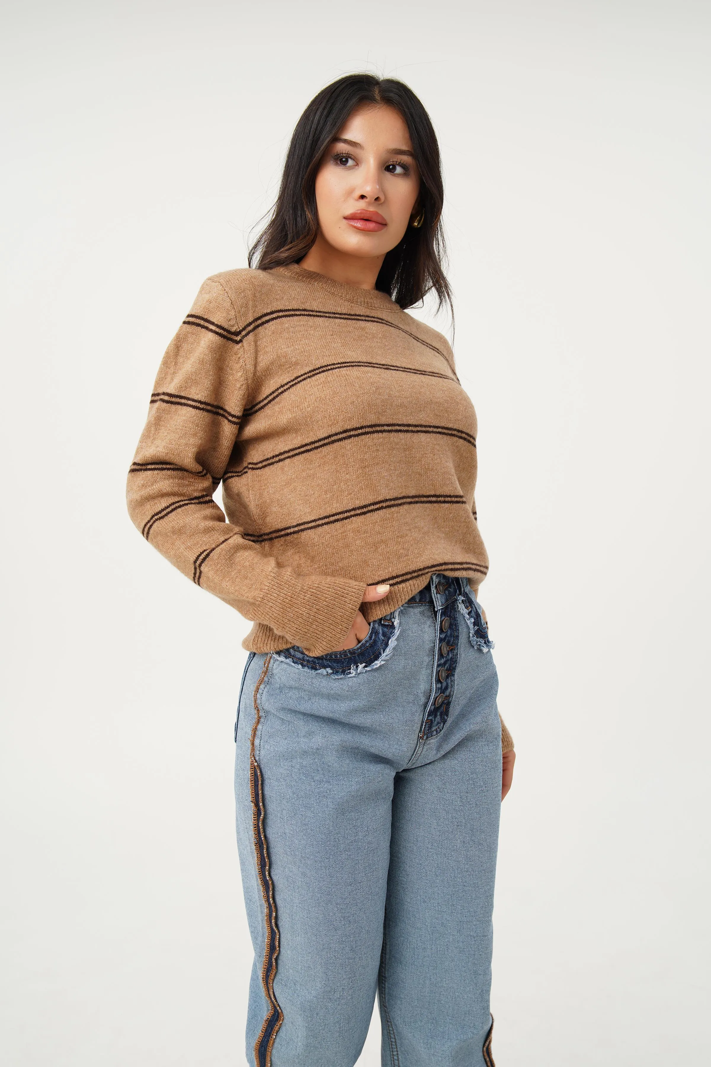 كنزة تريكو بنمط أرن مع ياقة بولو وتفصيل أمامي بشكل V يمنحك لمسة عملية يومية.