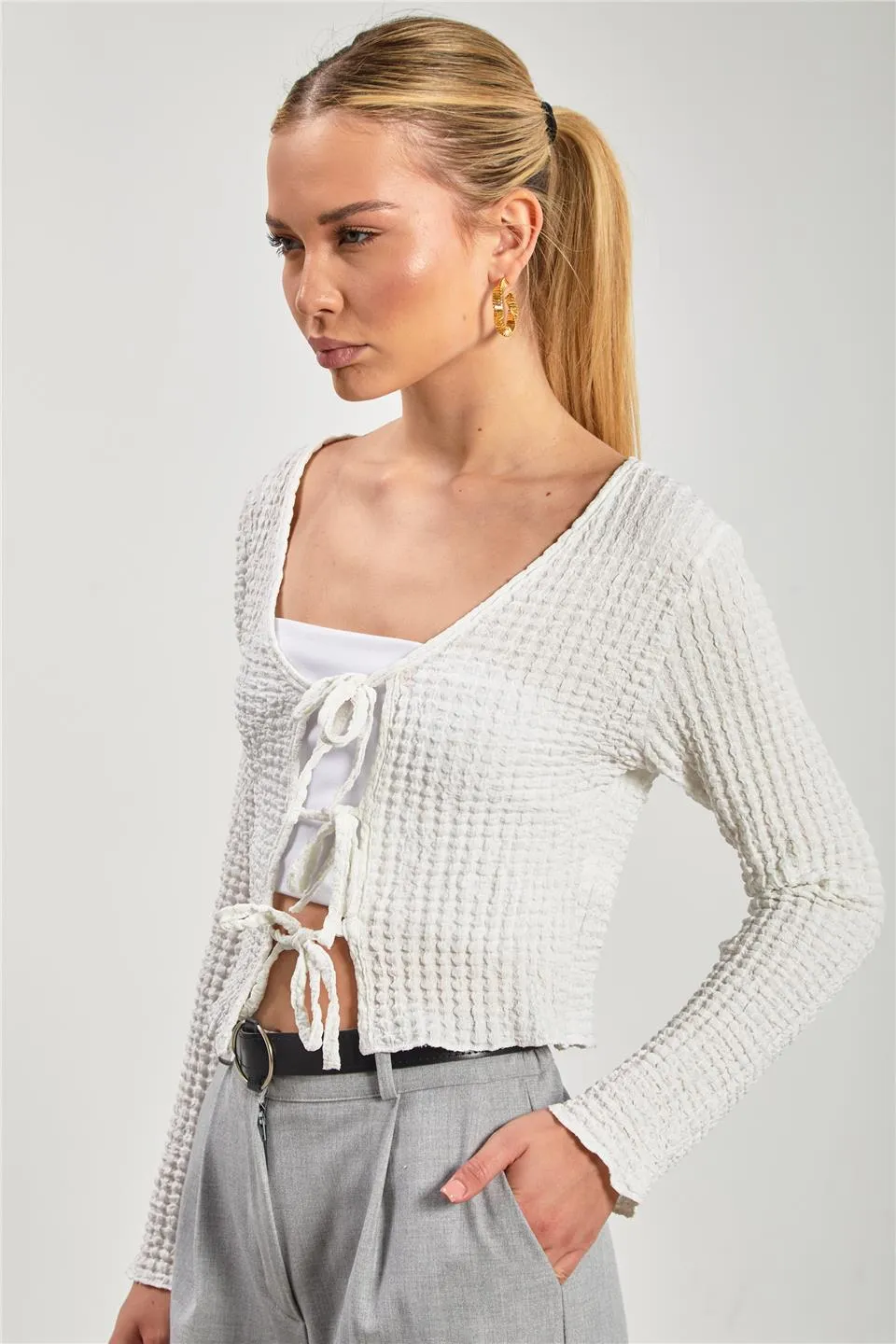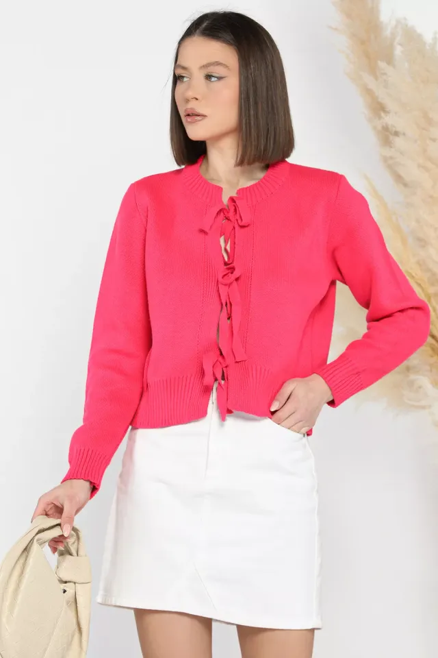 كارديجان نسائي محبوك بأكمام طويلة وتفاصيل فيونكة أنيقة، يوفر طبقة ناعمة وعصرية للارتداء اليومي. مصنوع من قماش خفيف وقابل للتنفس.