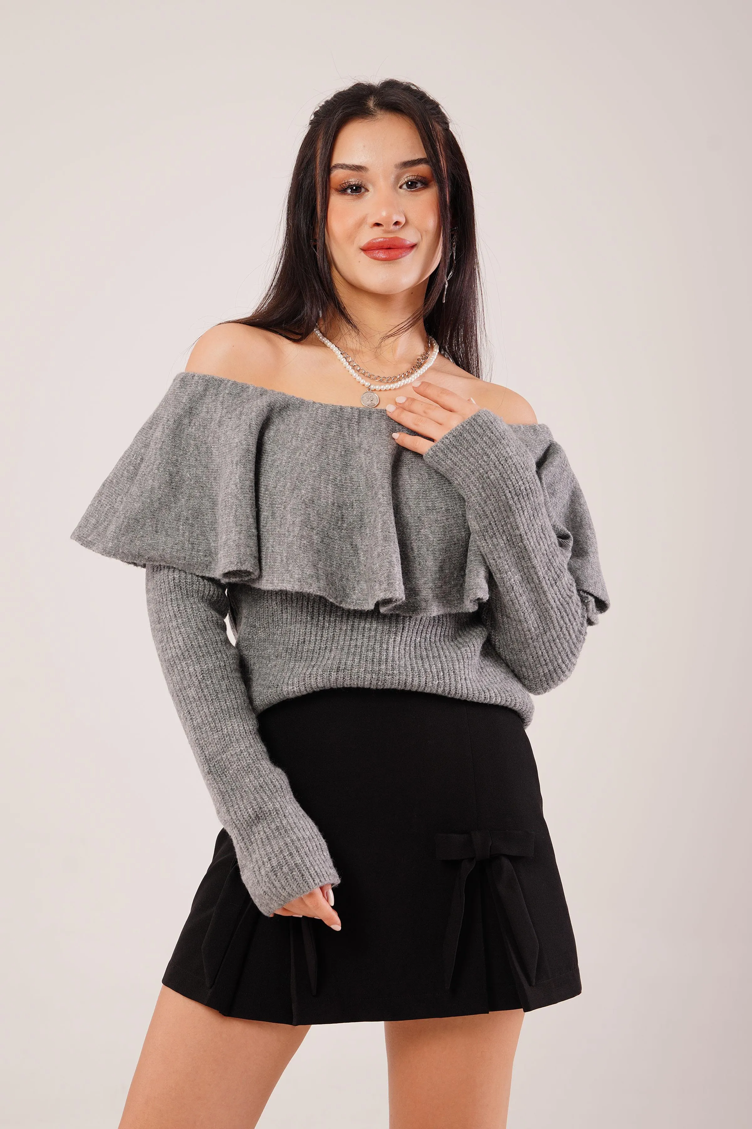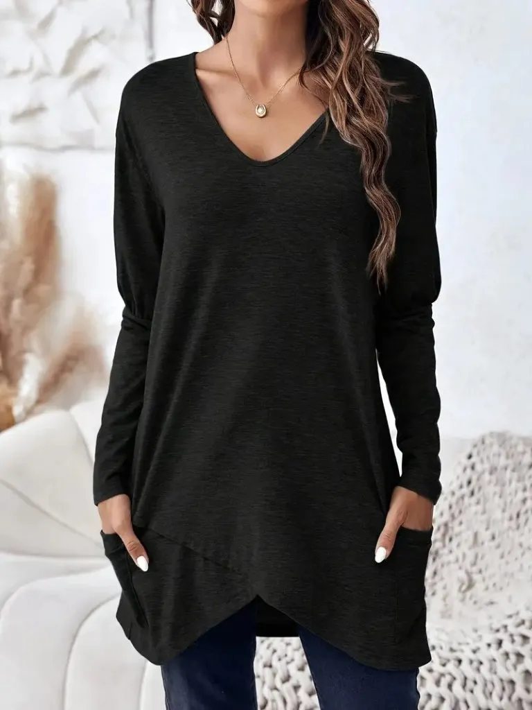 بلوزة بملمس ناعم وياقة متدلية بقصة غير متماثلة وحافة كلوش لِلوك يومي موسمي شيك ومريح.