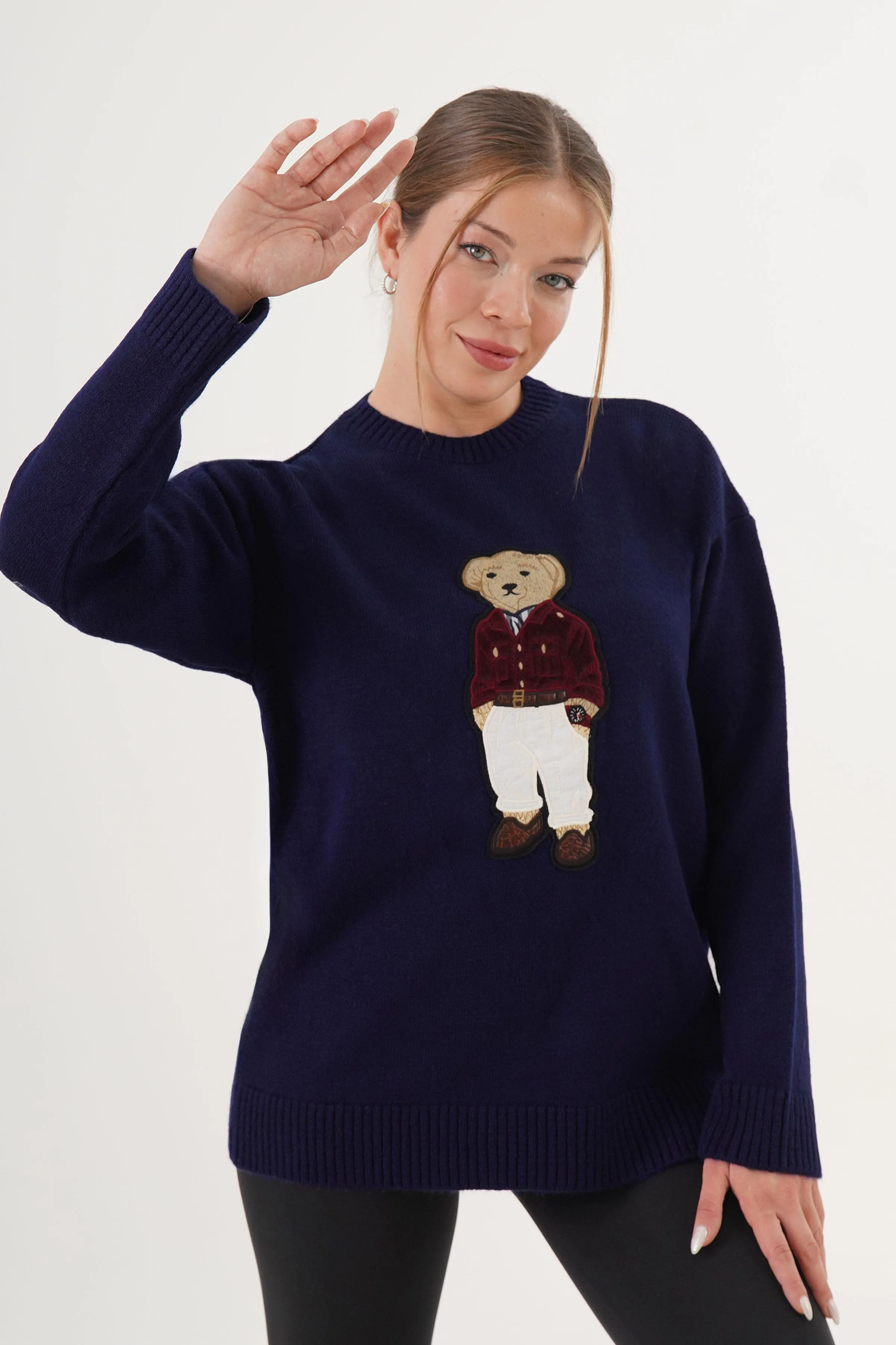 كنزة محبوكة شيك بتفاصيل لؤلؤ وحجر حول الياقة لِلوك شتوي ناعم وعصري.