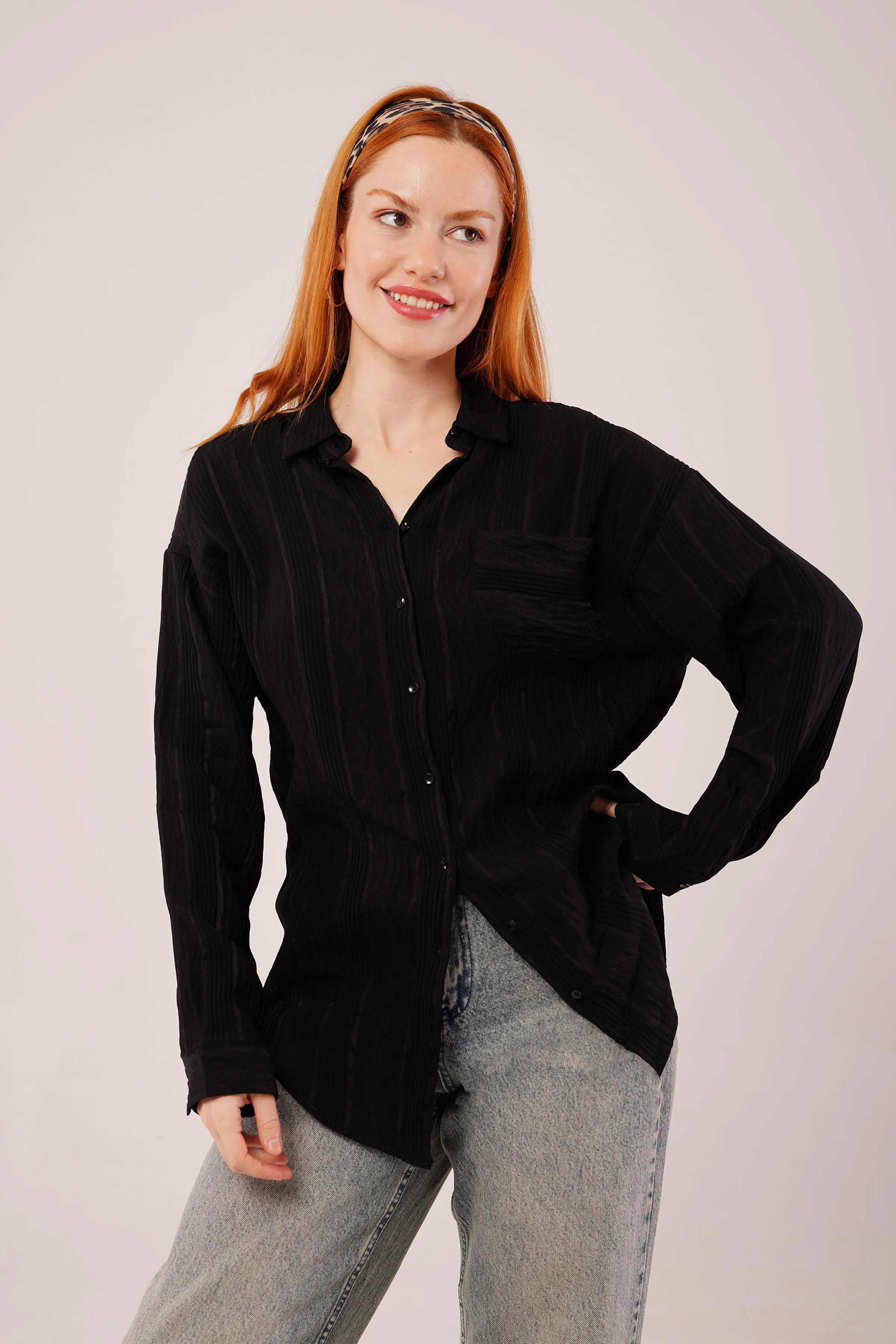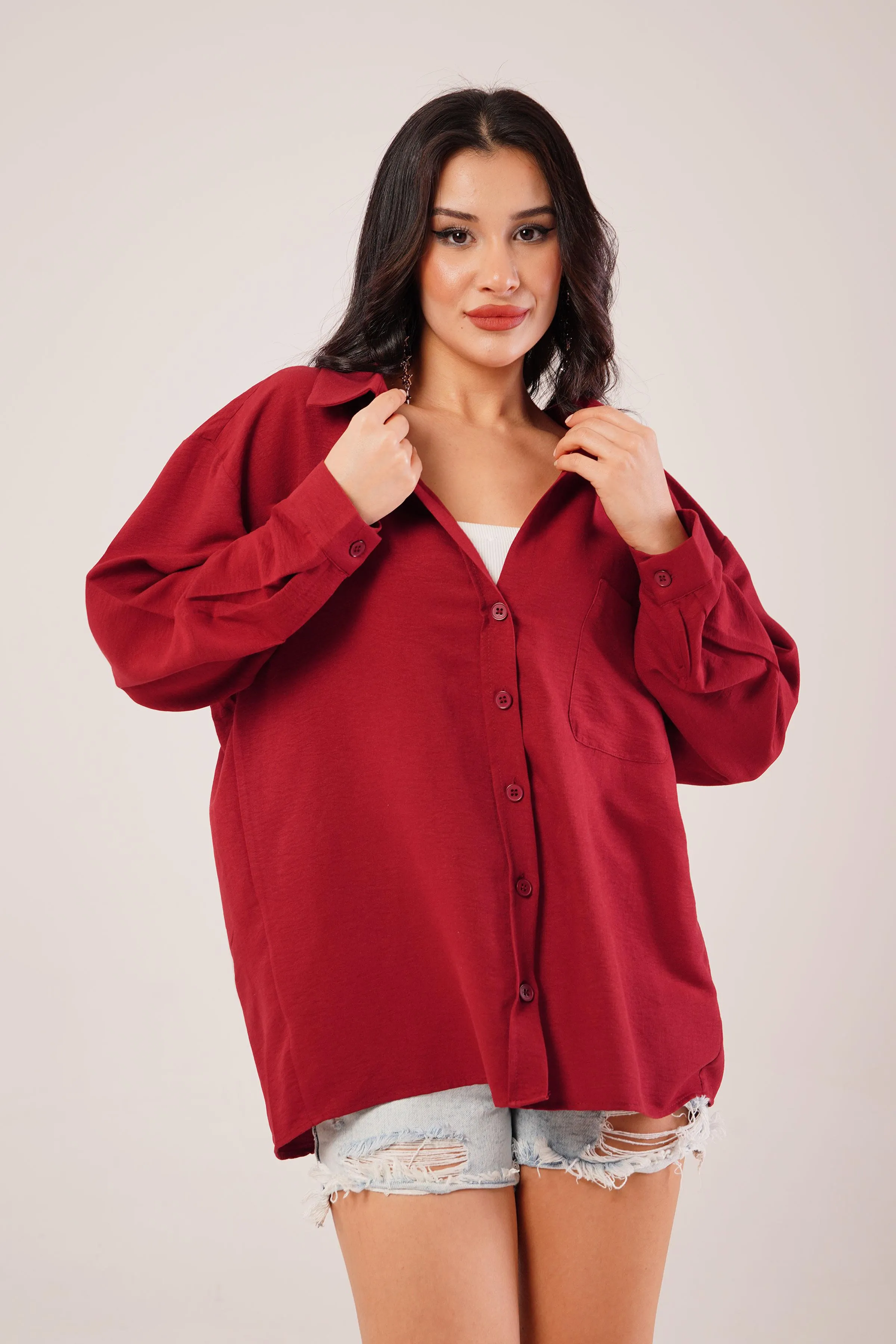 قميص نسائي بأكمام طويلة وتصميم أوفر سايز واسع مع جيب أمامي عملي، مصنوع من قماش ناعم ومريح، مناسب للإطلالات الكاجوال واليومية.
