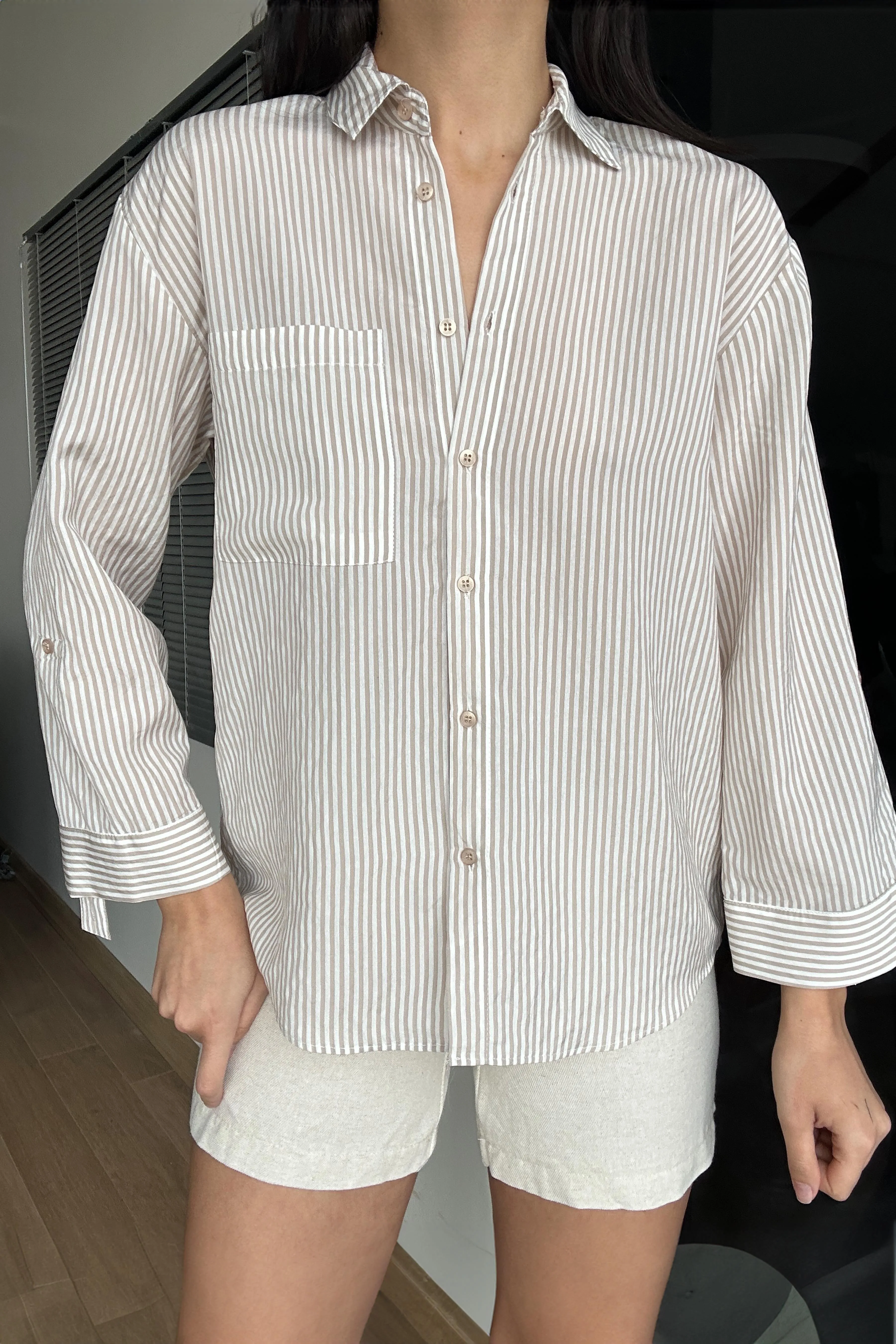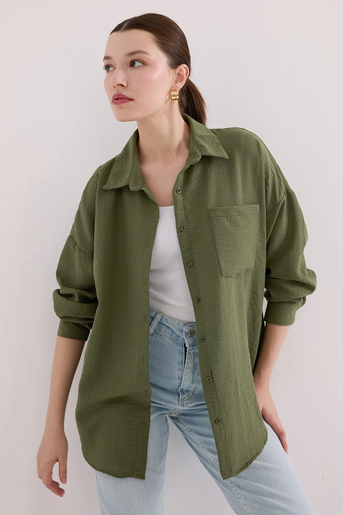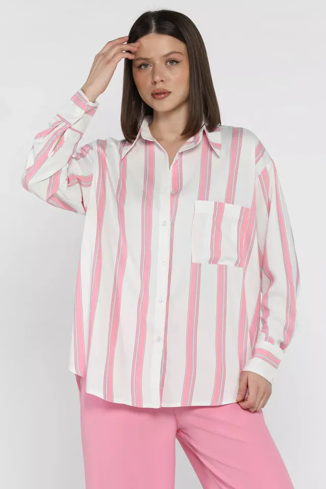 قميص نسائي بأكمام طويلة وتصميم أوفر سايز واسع مع جيب أمامي عملي، مصنوع من قماش ناعم ومريح، مناسب للإطلالات الكاجوال واليومية.