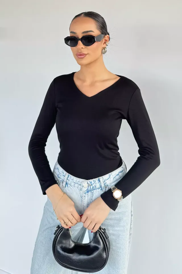 بودي نسائي سادة بأكمام طويلة وياقة دائرية كلاسيكية، مصنوعة من خامة ناعمة ومرنة تمنح الراحة ومظهراً أنيقاً، مثالي للارتداء اليومي أو للتنسيق مع قطع أخرى.