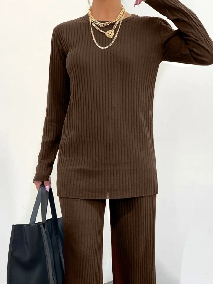 طقم نسائي بياقة مربعة وكروب وبنطال مستقيم - Beyond Store
