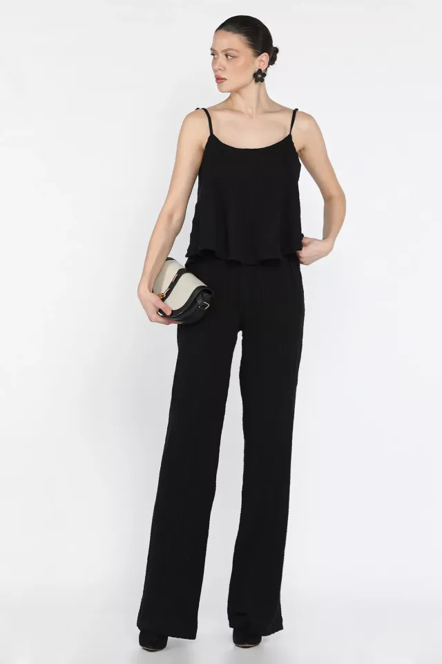 طقم نسائي شيك بياقة مربعة وكروب بحمالات عريضة مع بنطال مستقيم بخصر عالي لستايل صيفي مريح وعصري.