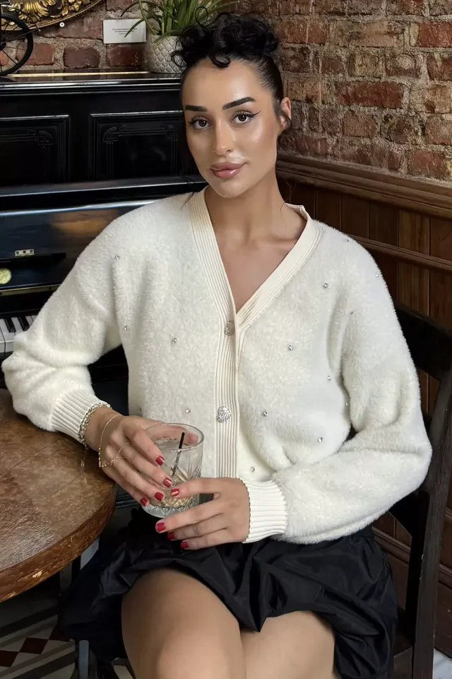 الموديل ترتدي مقاس S/36 – الطول ١٧٠ سم، الصدر ٨٦ سم، الخصر ٦٧ سم، الورك ٩٢ سم