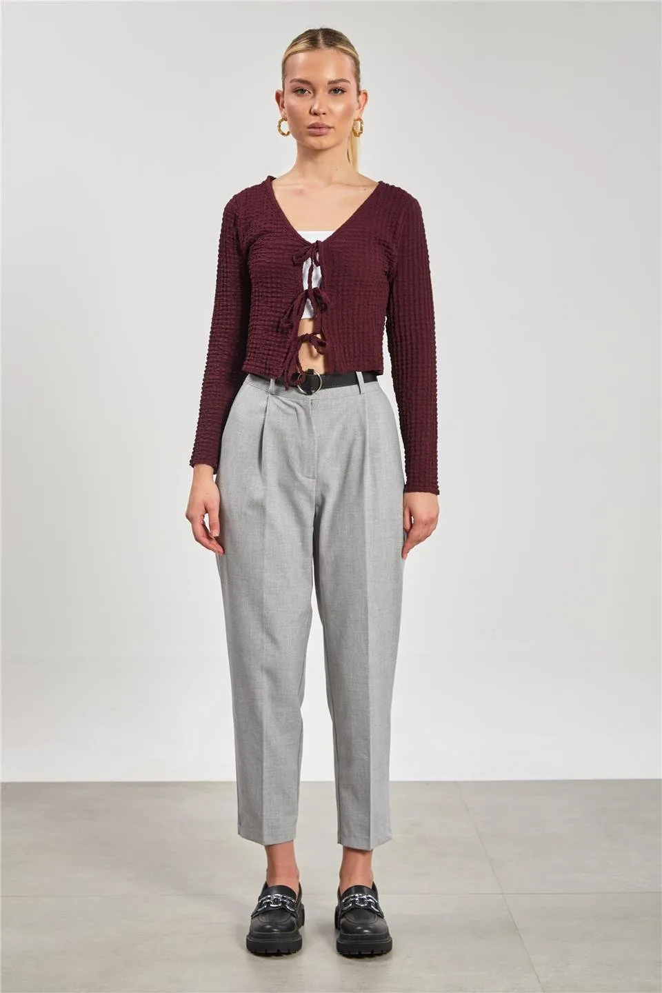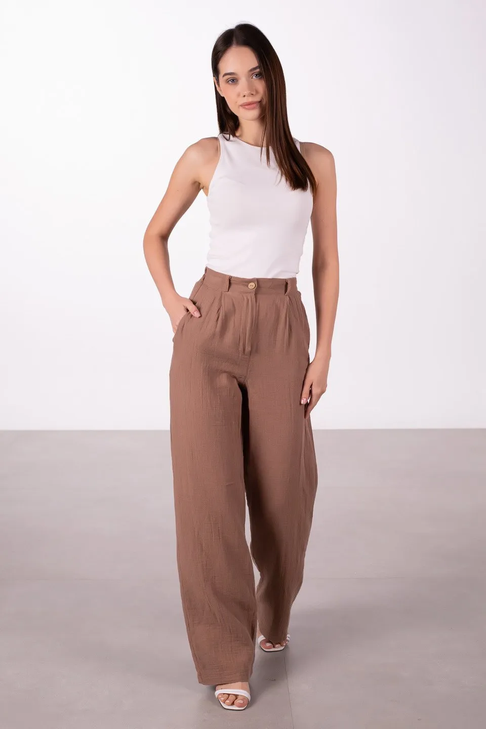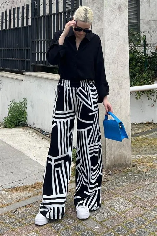 بنطلون نسائي واسع الساق بخصر مرتفع وتفاصيل درز أنيقة. تصميمه العصري يوفر راحة مثالية ومظهر أنيق يمكن تنسيقه بسهولة مع مختلف الإطلالات اليومية.