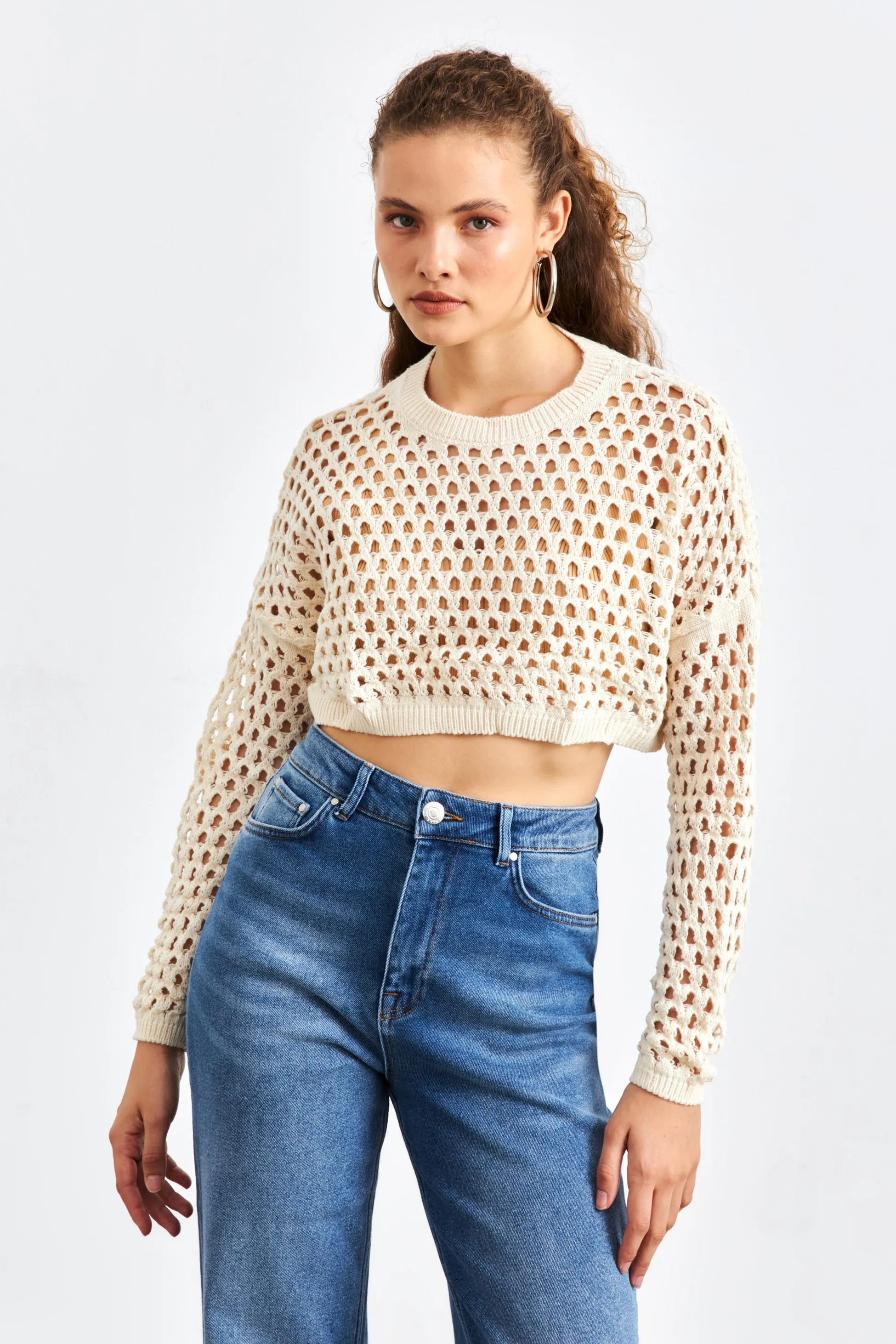 كنزة تريكو أوفرسايز بكتف منخفض ونمط باكلافا هندسي تعطي لوك شتوي يومي دافئ ومريح.