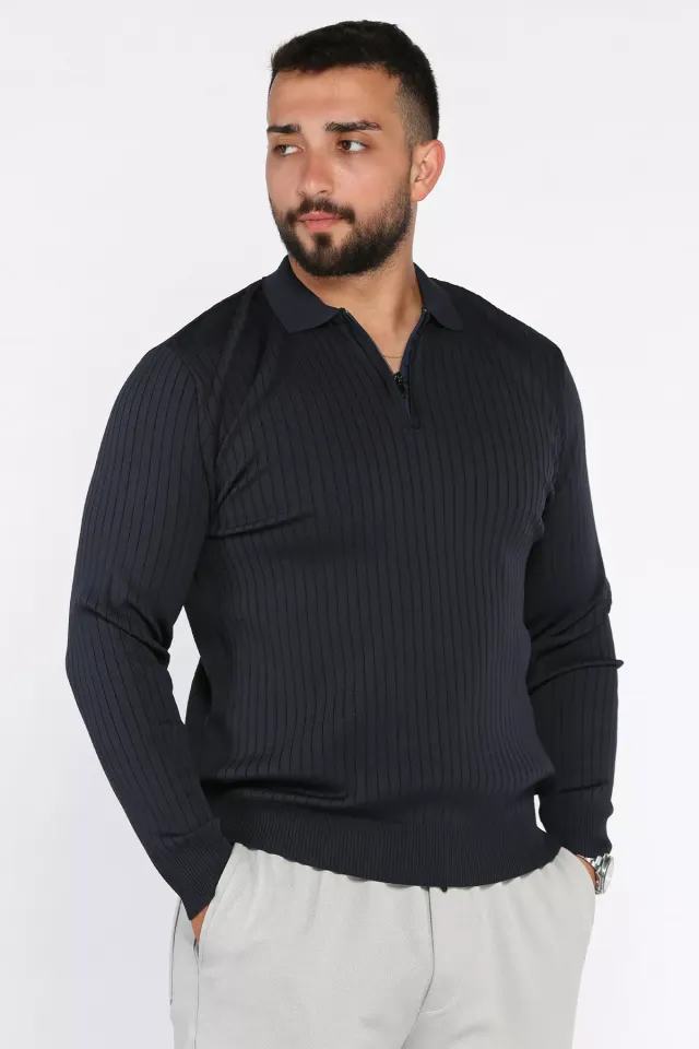 كنزة رجالية بحياكة مضلّعة بقصة مريحة وأكمام طويلة مع ياقة بولو - Beyond Store