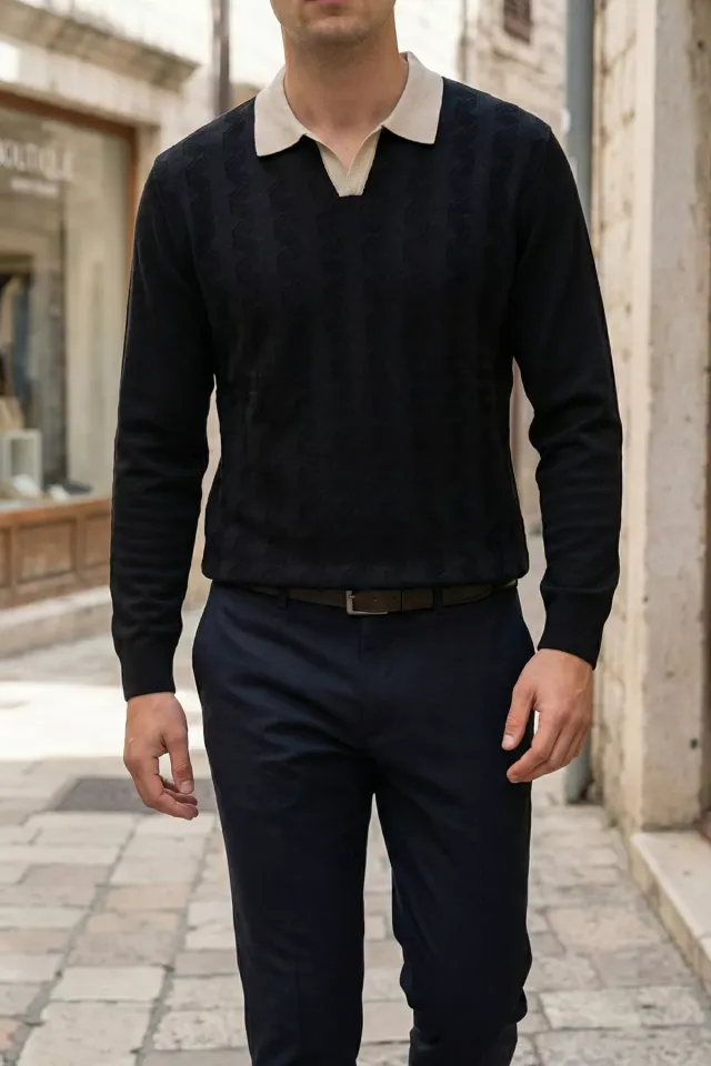 كنزة رجالية بحياكة مضلّعة بقصة مريحة وأكمام طويلة مع ياقة بولو - Beyond Store