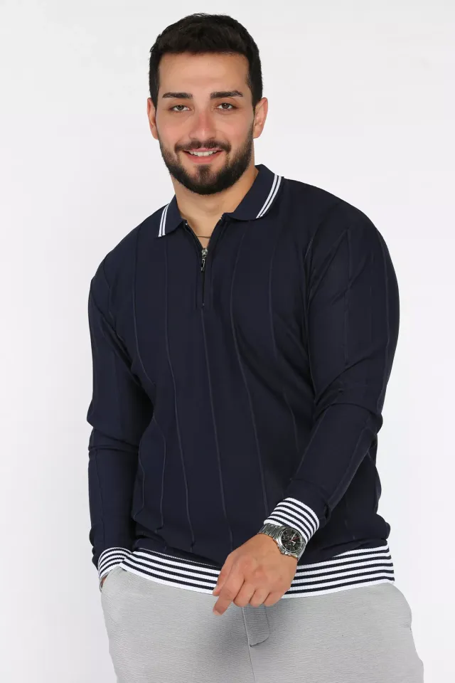 كنزة رجالية محاكة بأكمام طويلة وقصة مريحة مع ياقة بولو، مصنوعة من مزيج 80% بولي أميد و15% فيسكوز و5% ليكرا، تمنح مرونة جيدة وثبات شكل ومظهر مرتب.
