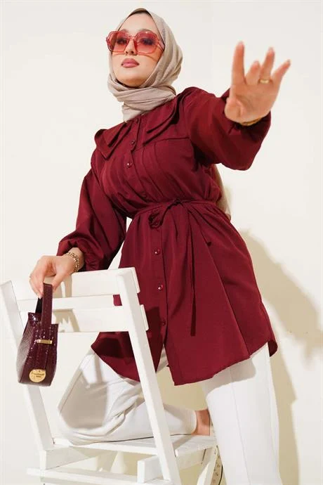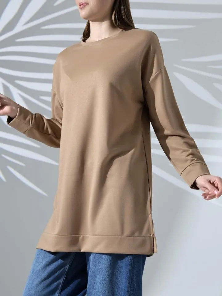 تونيك محبوك ناعم بياقة دائرية مع وشاح أنيق مدمج، يمنح إطلالة محتشمة وعصرية. يتميز بقماش خفيف ومريح يناسب الإطلالات اليومية بسهولة وأناقة.
