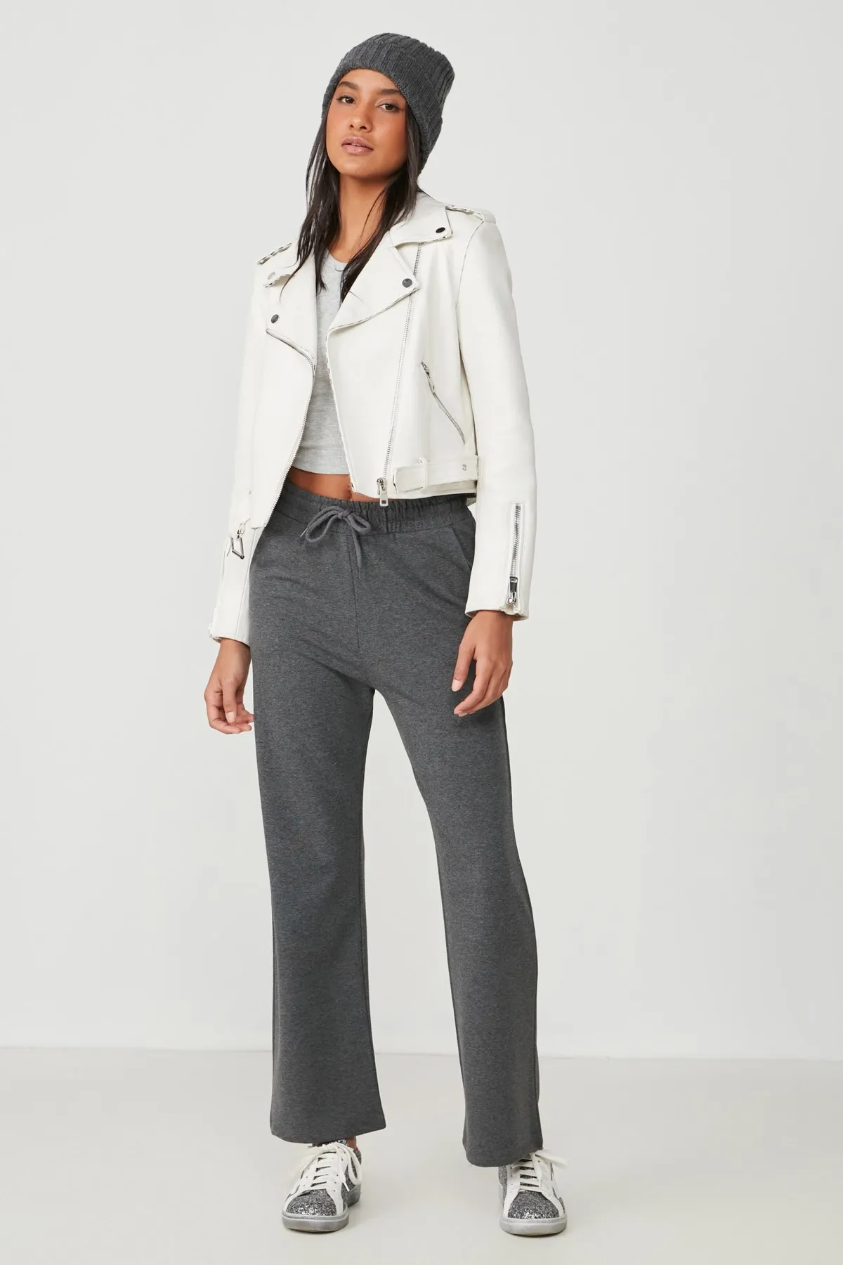 بنطلون رياضي نسائي بخصر مرتفع مطاطي وساق مطاطية مع رباط خصر وتفاصيل حجرية أنيقة. مصنوع من قماش ناعم ومرن يمنح راحة وانسيابية طوال اليوم، مثالي للإطلالات الكاجوال والرياضية اليومية.
