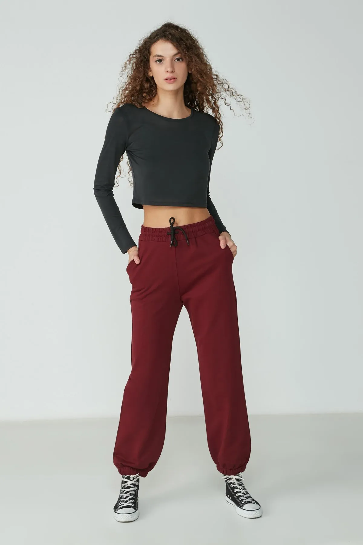 بنطلون رياضي نسائي بخصر مرتفع مطاطي وساق مطاطية مع رباط خصر وتفاصيل حجرية أنيقة. مصنوع من قماش ناعم ومرن يمنح راحة وانسيابية طوال اليوم، مثالي للإطلالات الكاجوال والرياضية اليومية.