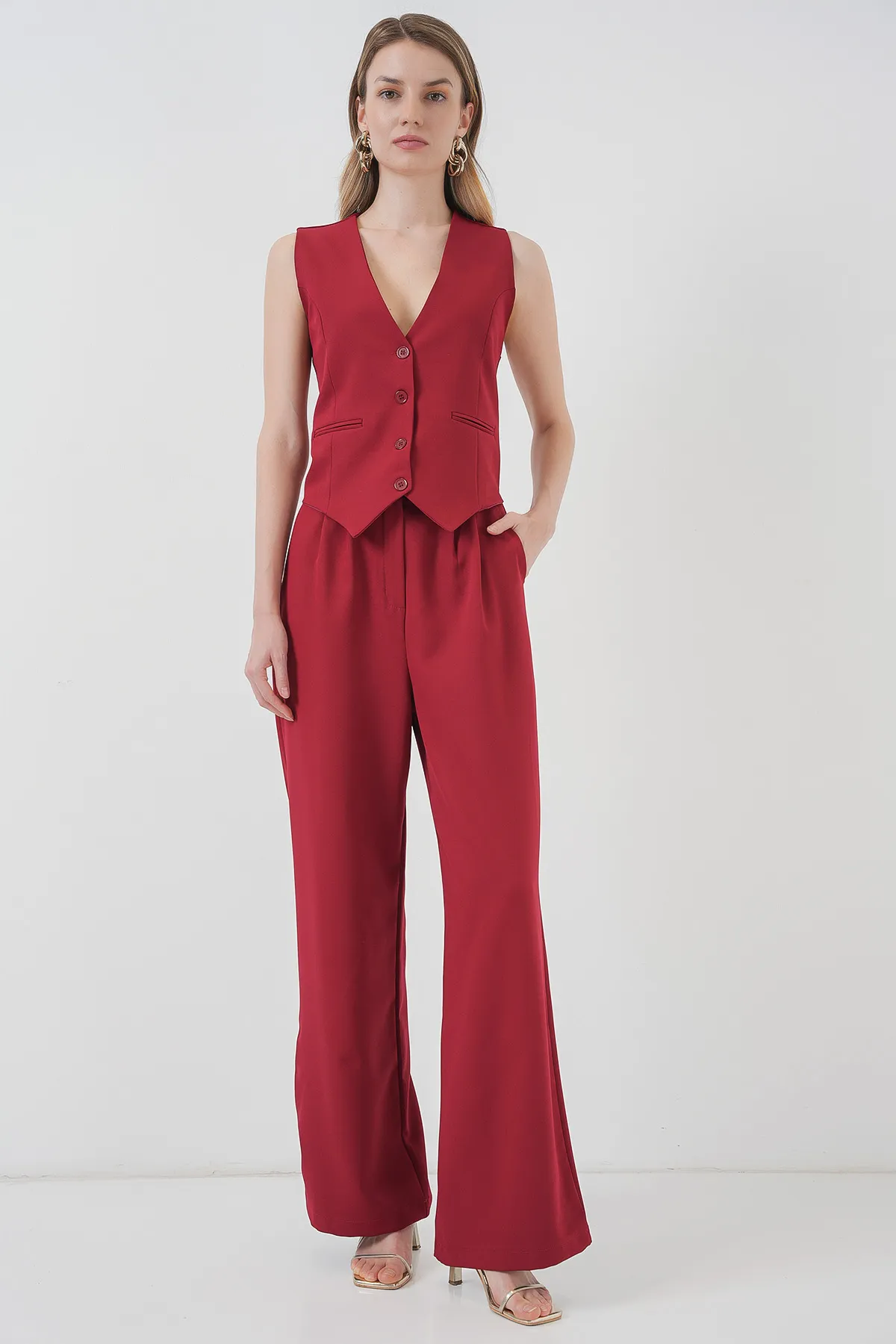 الموديل ترتدي مقاس 38 – الطول 172 سم، الوزن 53 كغ، الصدر 83 سم، الخصر 70 سم، الورك 91 سم