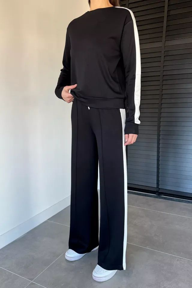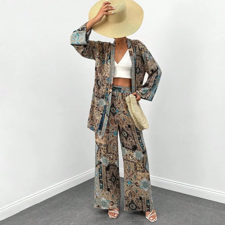 طقم مريح بنقشة منقوشة بقصة عملية وتيشيرت ياقة دائرية وبنطال بخصر مطاطي لإطلالة يومية دافئة وعملية.