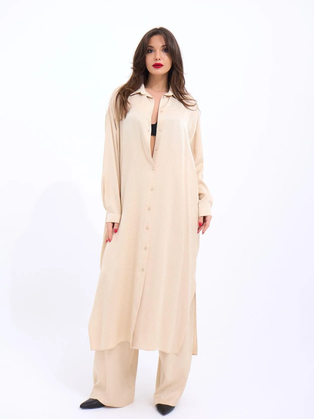 الموديل ترتدي مقاس 38 – الطول 176 سم، الصدر 90 سم، الخصر 63 سم، الورك 94 سم