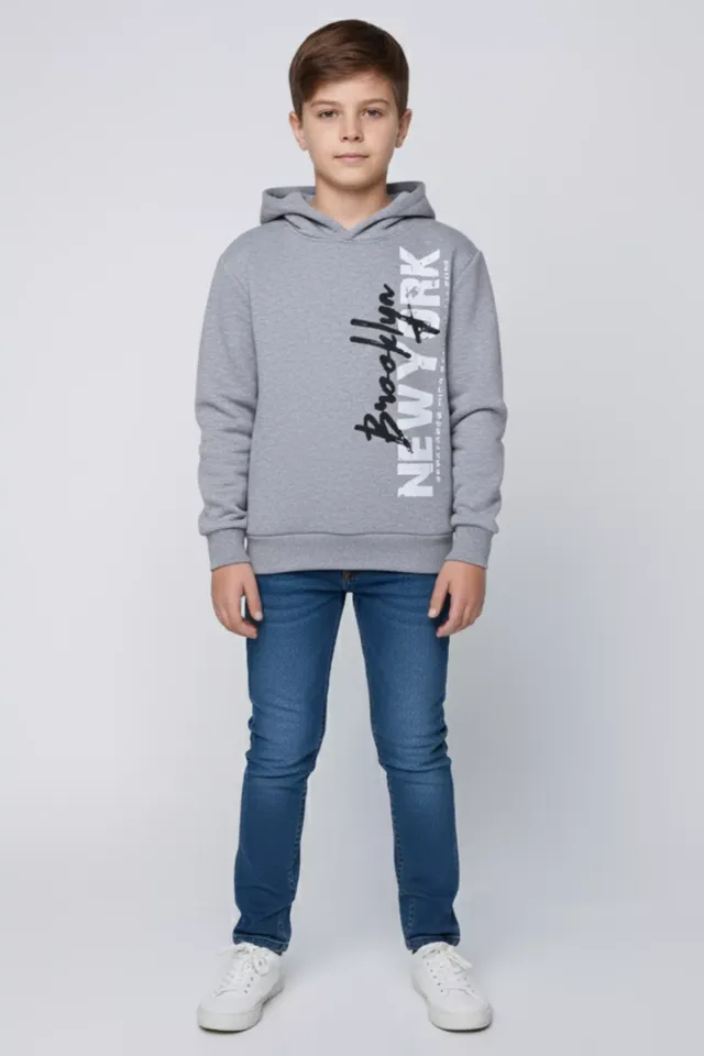 هودي للأولاد بتصميم مريح مزود بغطاء رأس وطبعة عصرية مع جيب أمامي عملي للاستخدام اليومي. مصنوع من قماش ناعم ومتين بقصة عادية توفر الراحة وحرية الحركة طوال اليوم.