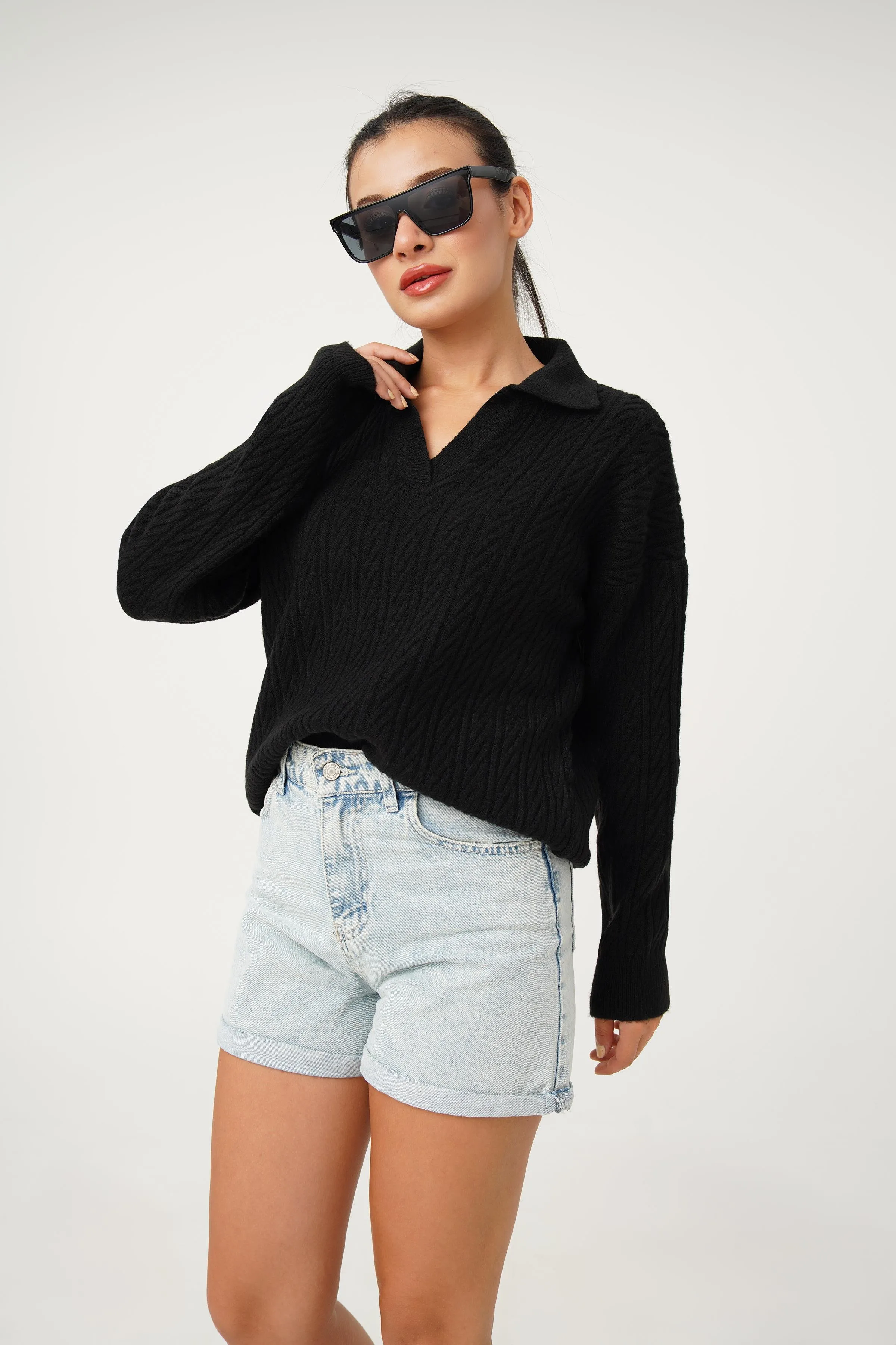 بلوزة تريكو نسائية بقصة مريحة وياقة دائرية واسعة وكتف منخفض لِلوك صيفي خفيف وعصري.