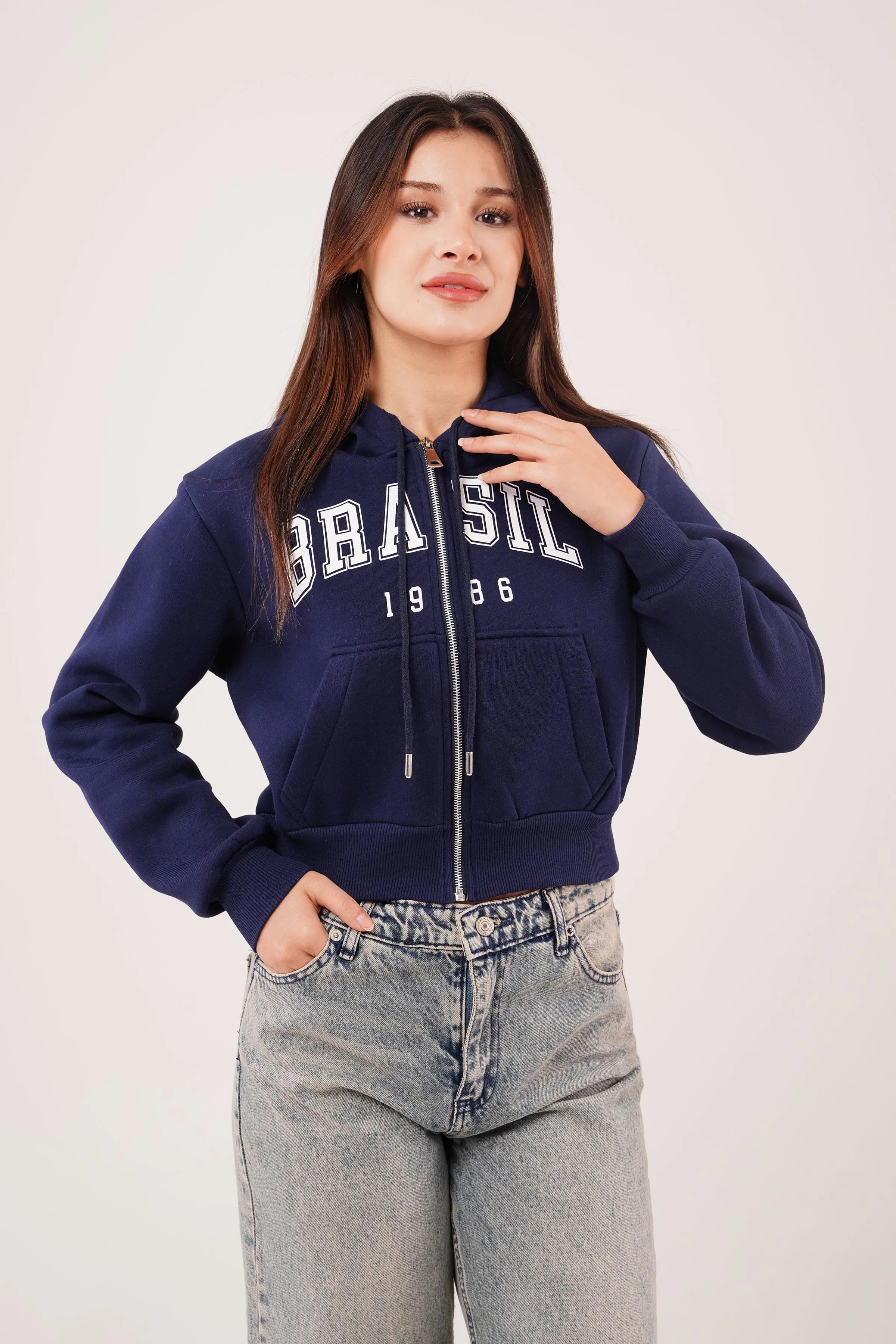 توب سويتشيرت قصير بقصة محددة وياقة واقفة مع سحاب أمامي وتفصيل تمرير الإصبع لستايل يومي عملي.