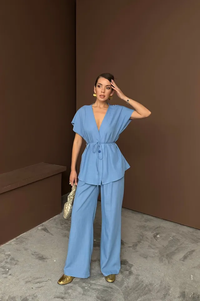 طقم نسائي أنيق يتكون من بلوزة بدون أكمام مزينة بتفاصيل كشكشة وبنطلون بخصر مطاطي وأساور عند الساقين لتوفير الراحة والمرونة. تصميم عملي وأنيق يناسب الاستخدام اليومي والمناسبات العفوية، ويمنح إطلالة أنثوية عصرية.