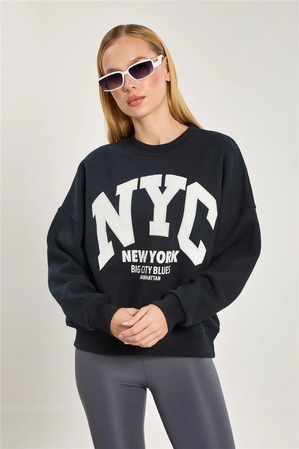 سويتشيرت أوفر سايز مرصّع بحجر بياقة دائرية وكتف منخفض لستايل يومي دافئ وأنيق.