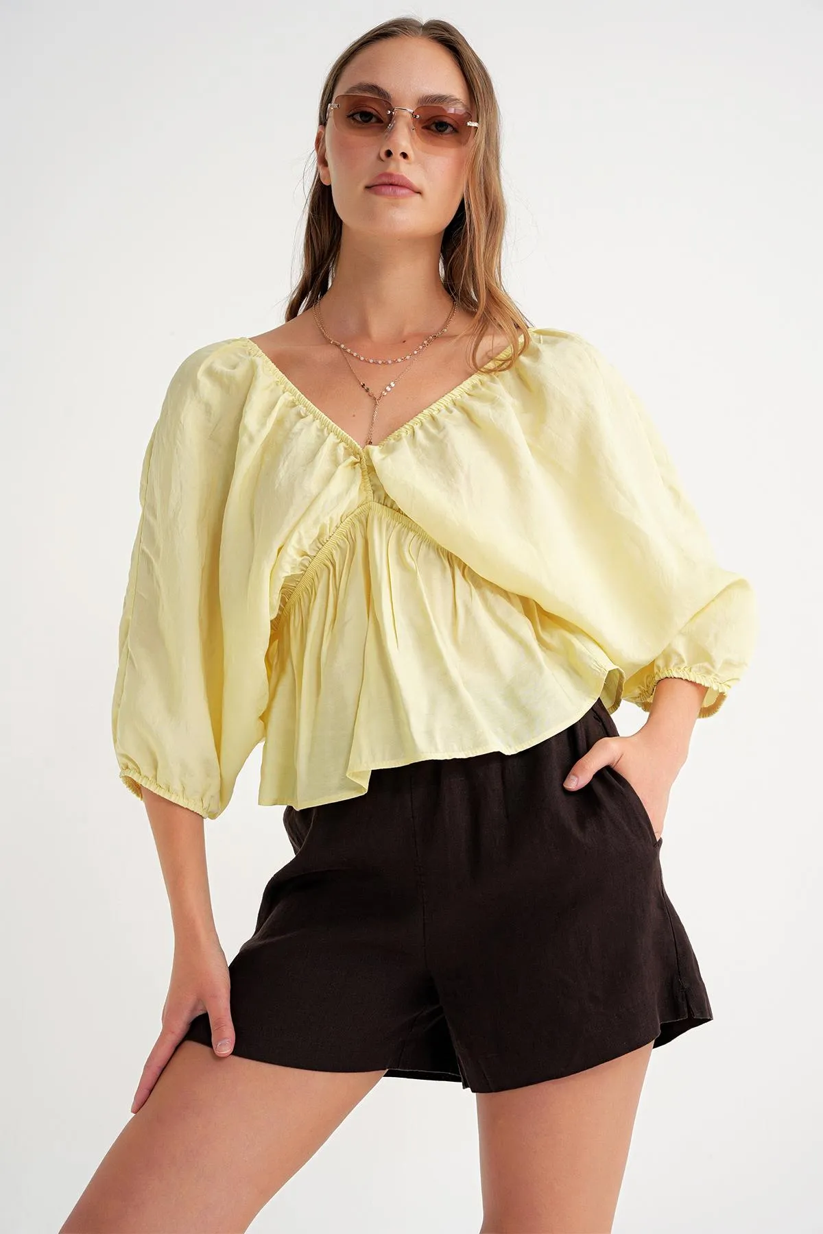 بلوزة نسائية بأكمام طويلة وياقة على شكل حرف V مصنوعة من قماش الفيسكوز الناعم لراحة خفيفة ومظهر بسيط وأنيق، مناسبة للاستخدام اليومي وسهلة التنسيق.