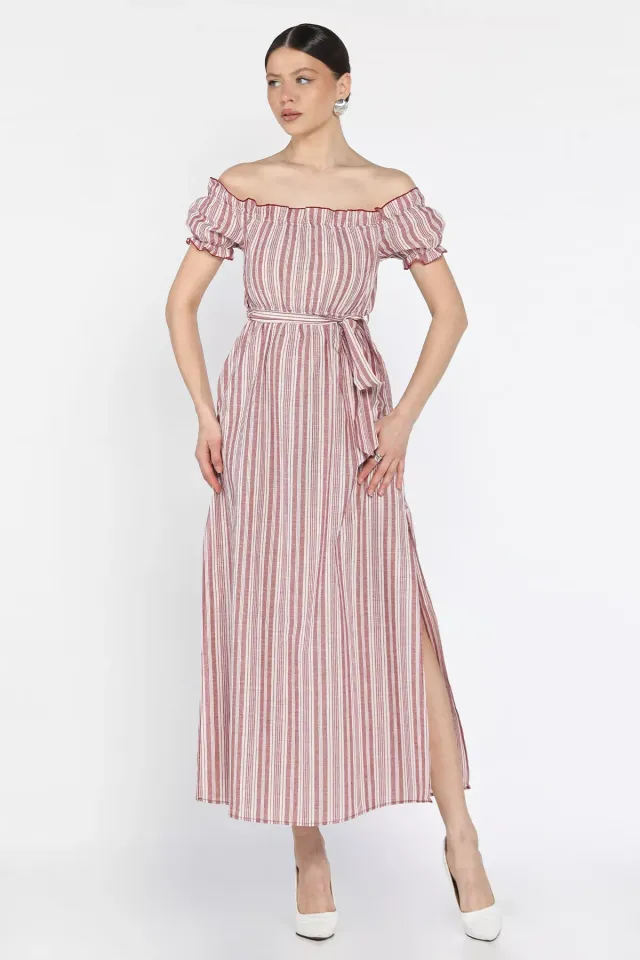 فستان ميدي مودال بياقة V مع تفصيل مخطط ناعم يمنح لوك يومي مريح وقصة A شيك وعصرية.