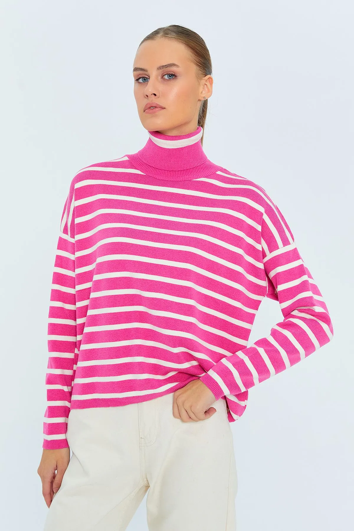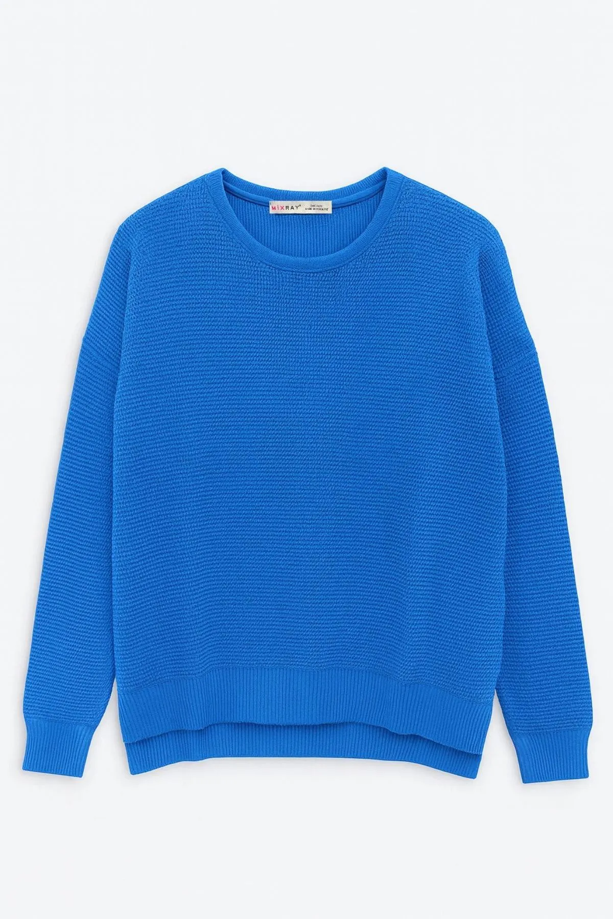 بلوزة تريكو مضلعة بياقة V وأكمام واسعة مزمومة من الأسفل لستايل شتوي مريح وسهل التنسيق.
