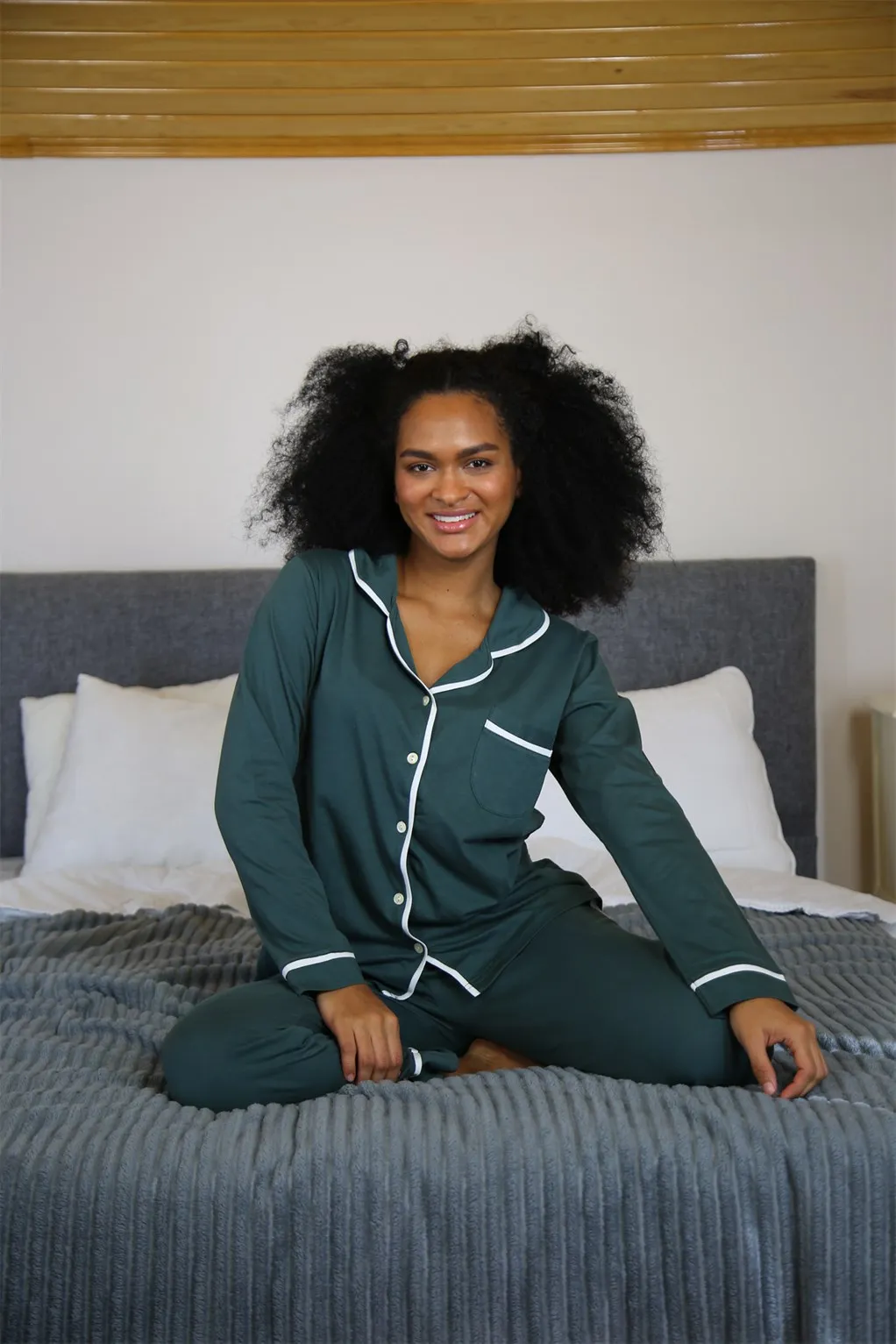 طقم بيجاما نسائي من قماش المخمل بأكمام طويلة وخصر مطاطي، مصنوع من قماش ناعم ودافئ يمنح إحساسًا بالراحة والدفء طوال الليل. تصميمه المريح والأنيق مثالي للاستخدام المنزلي اليومي وليالي المواسم الباردة.
