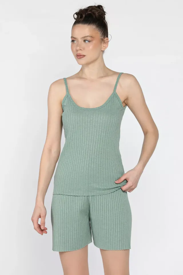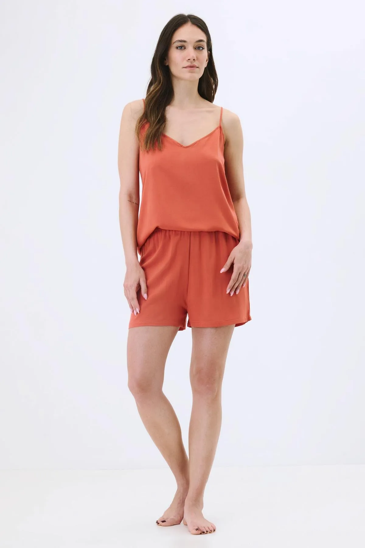 طقم البيجاما بأكمام قصيرة مع ياقة دائرية وحزام خصر مطاطي لملاءمة مريحة وسهلة. مثالي للاسترخاء أو الاستراحة، يقدم إطلالة بسيطة وأنيقة للاستخدام اليومي، ويُعد خيارًا مثاليًا لأيام وليالي الصيف الدافئة.